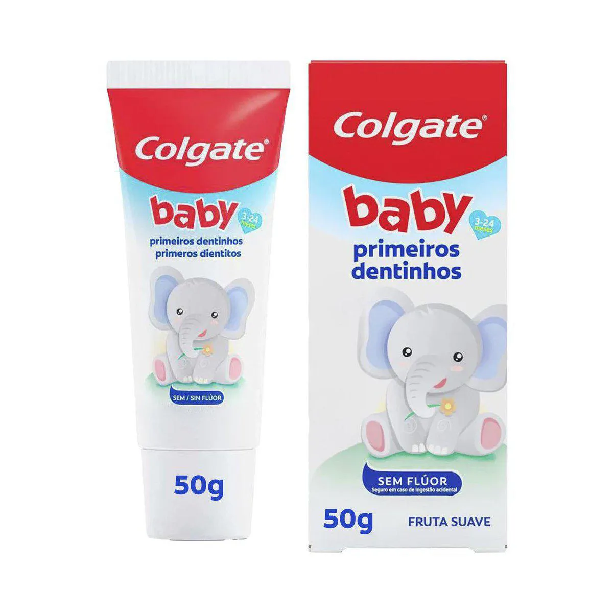 Colgate Baby Primeiros Dentinhos sem Flúor é um gel dental indicado para crianças de 3 a 24 meses, acompanhando os primeiros passos da rotina diária de escovação do bebê. Sua fórmula é livre de açúcar, lauril sulfato de sódio, corantes artificiais e conservantes, sendo bastante segura mesmo em caso de ingestão do bebê. E conta com um sabor agradável e suave de fruta.