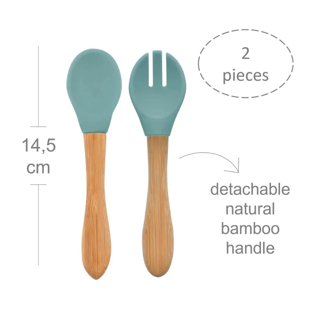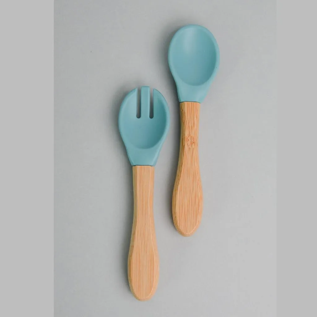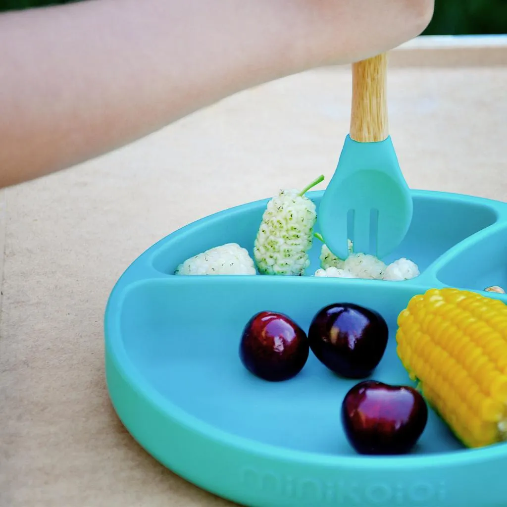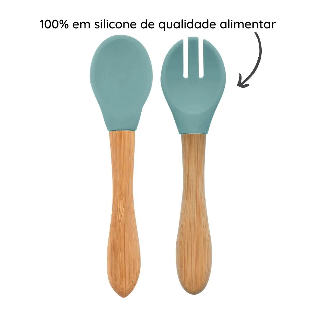Colher e Garfo Silicone e Bambu Dig In Aqua Green - Minikoioi