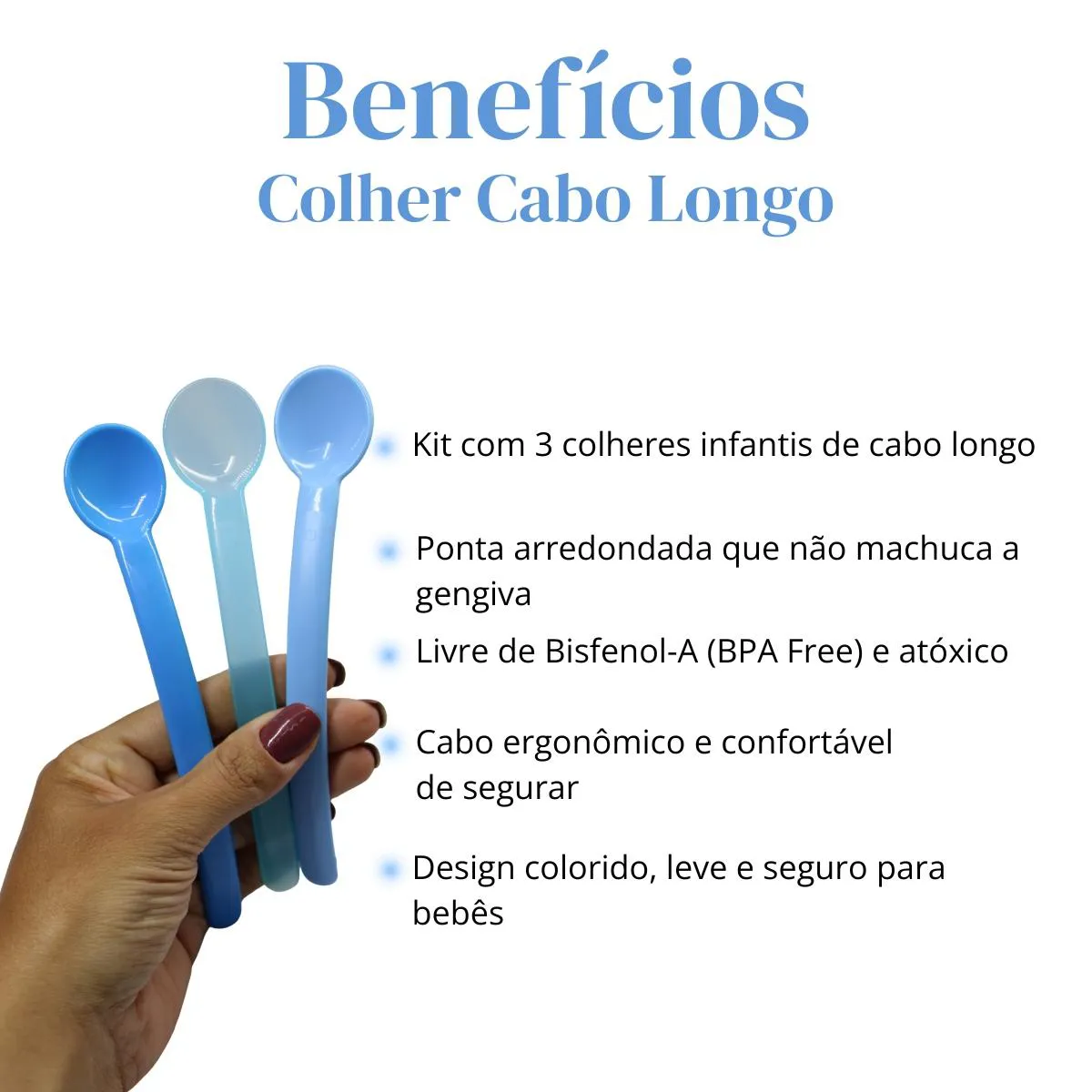 - Cabo longo que permite alcançar facilmente o fundo de potes e papinhas.