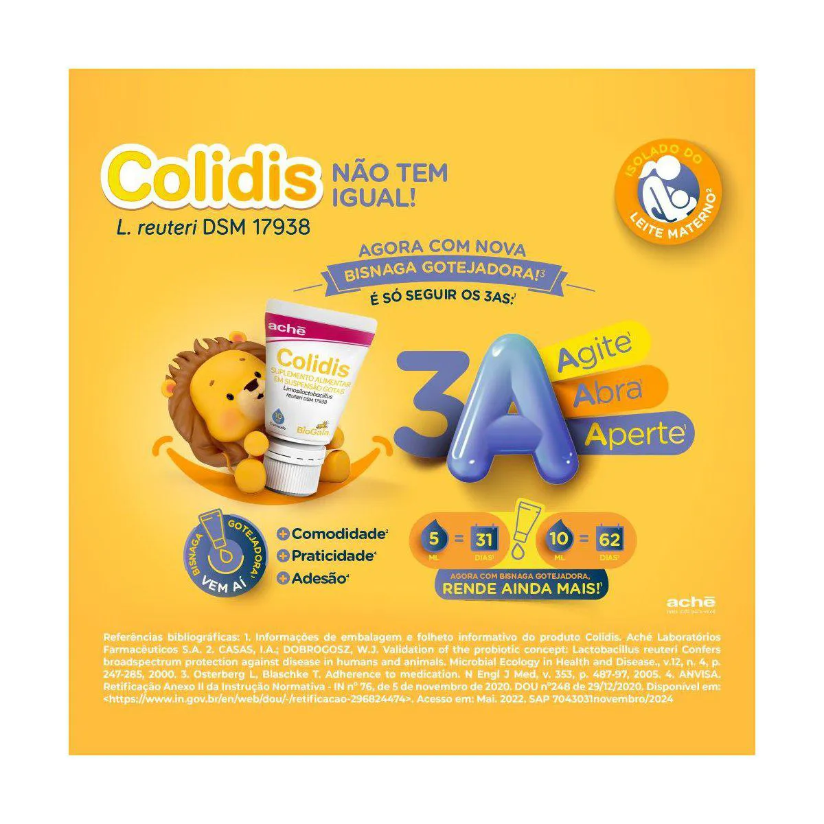 Colidis é um alimento funcional indicado para o equilíbrio da flora intestinal, atuando diretamente no desconforto intestinal dos bebês. Seu consumo deve estar associado a uma dieta equilibrada e hábitos de vida saudáveis. O consumo de 5 gotas por dia fornece 1x108 UFC de Lactobacillus reuteri DSM 17938, ou seja, mais de 100 milhões de probióticos que regulam a flora intestinal e inibem a proliferação de bactérias.