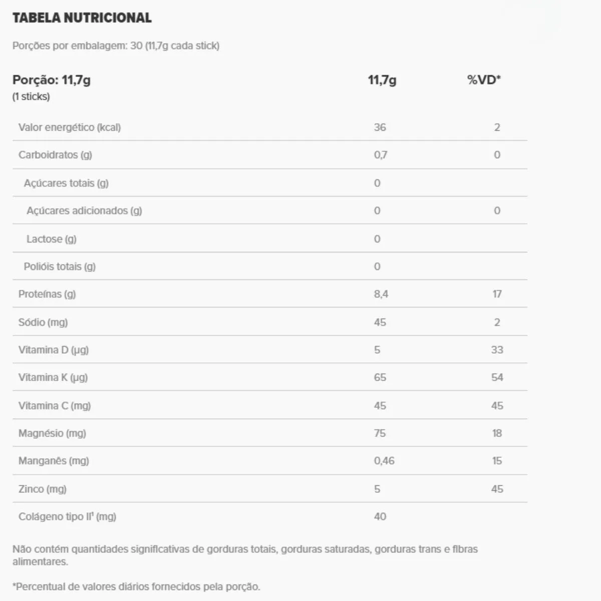 A fórmula contém colágeno tipo II, ácido hialurônico, metilsulfonilmetano, vitamina C, minerais e adoçantes naturais, sem glúten, lactose, açúcar ou corantes artificiais.