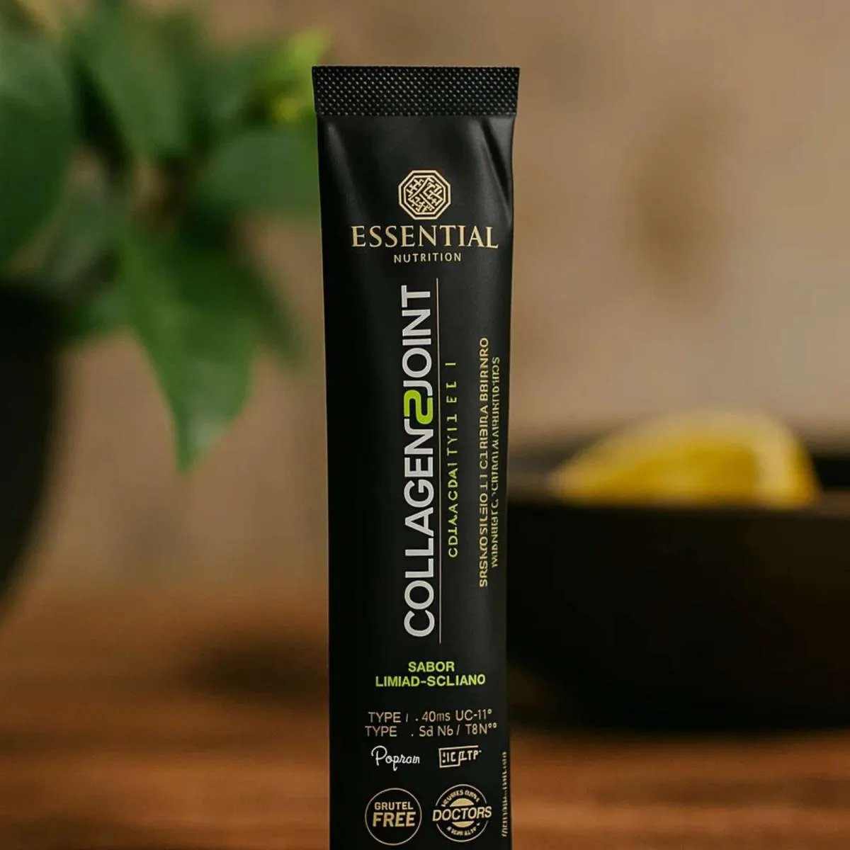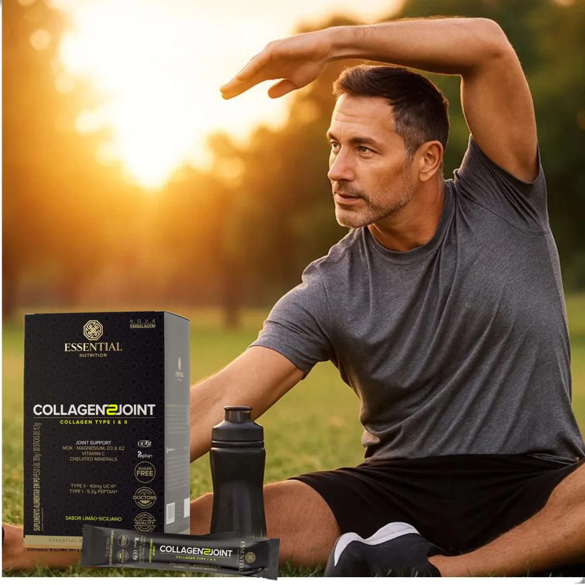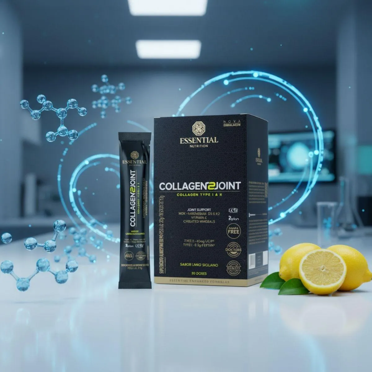 Collagen 2 Joint Articulações da Essential Nutrition oferece 30 sachês de 10 g, totalizando 330 g, formulados com colágeno tipo II não desnaturado, ácido hialurônico, MSM e vitamina c. Foi elaborado para complementar a dieta com nutrientes presentes em articulações.