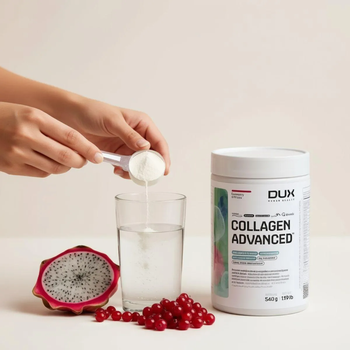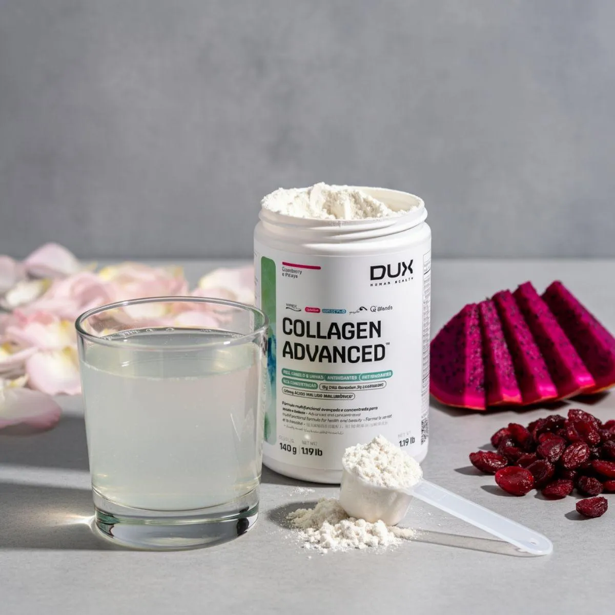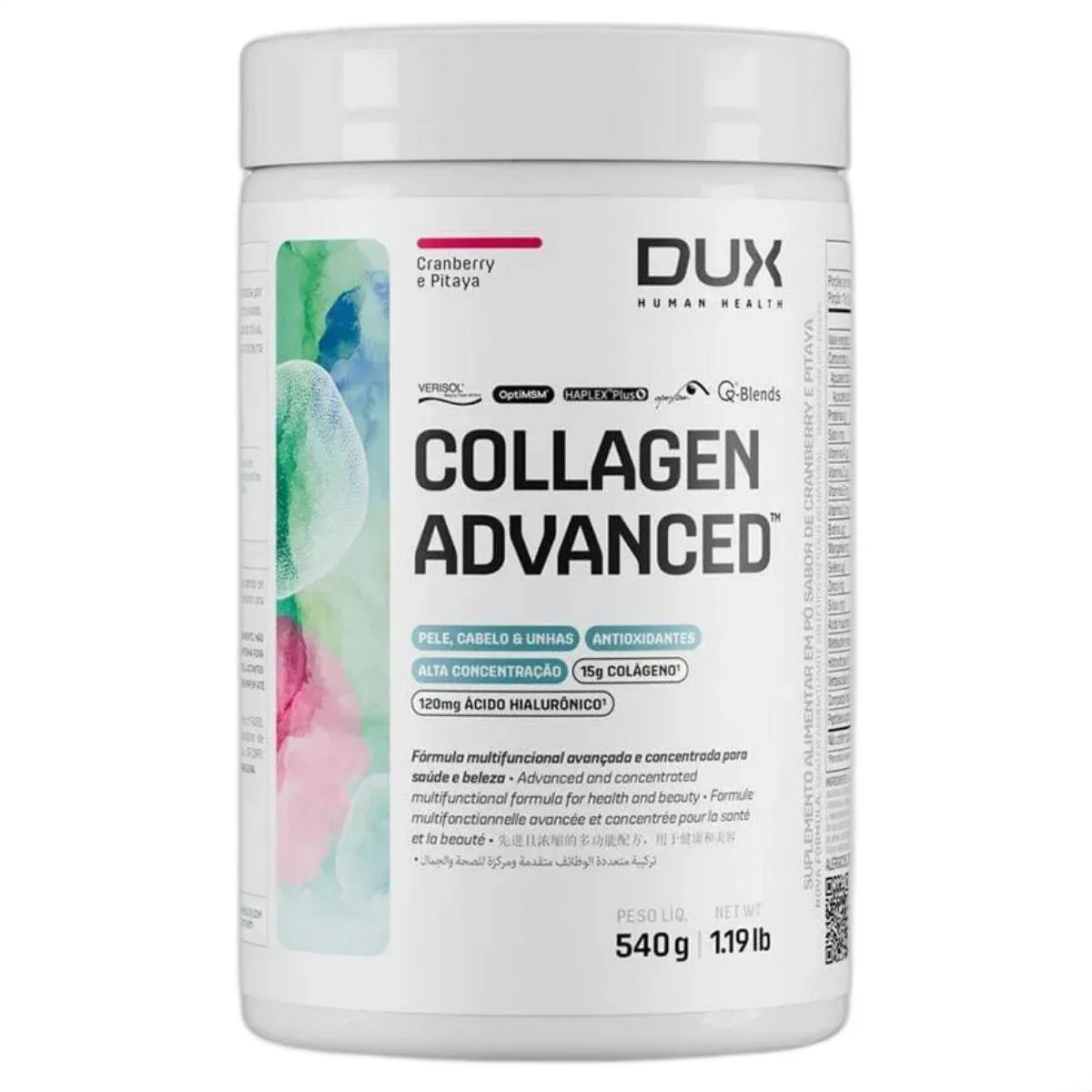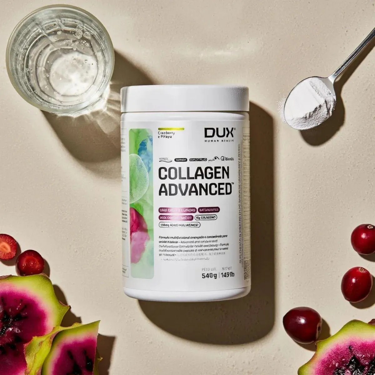 O Collagen Advanced MSM da Dux une peptídeos de colágeno hidrolisado a MSM (metilsulfonilmetano) e ácido hialurônico, proporcionando uma fórmula completa para cuidados com a pele e articulações. Também inclui vitamina C e biotina, nutrientes que participam da formação de colágeno e queratina. O suplemento não contém açúcar, glúten ou lactose.