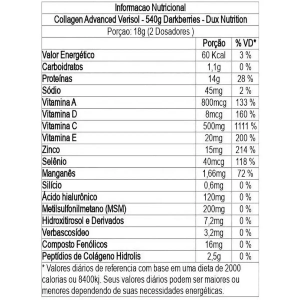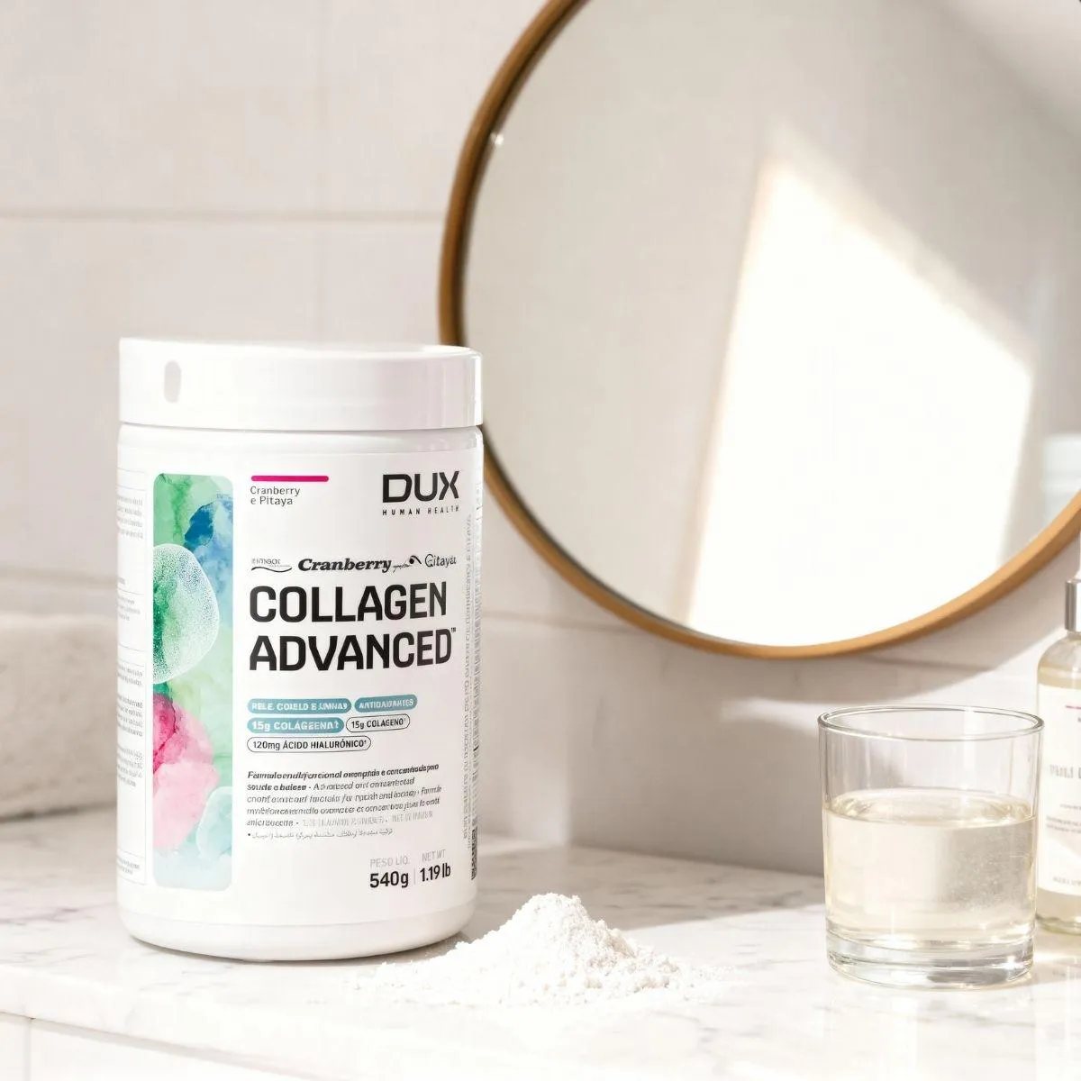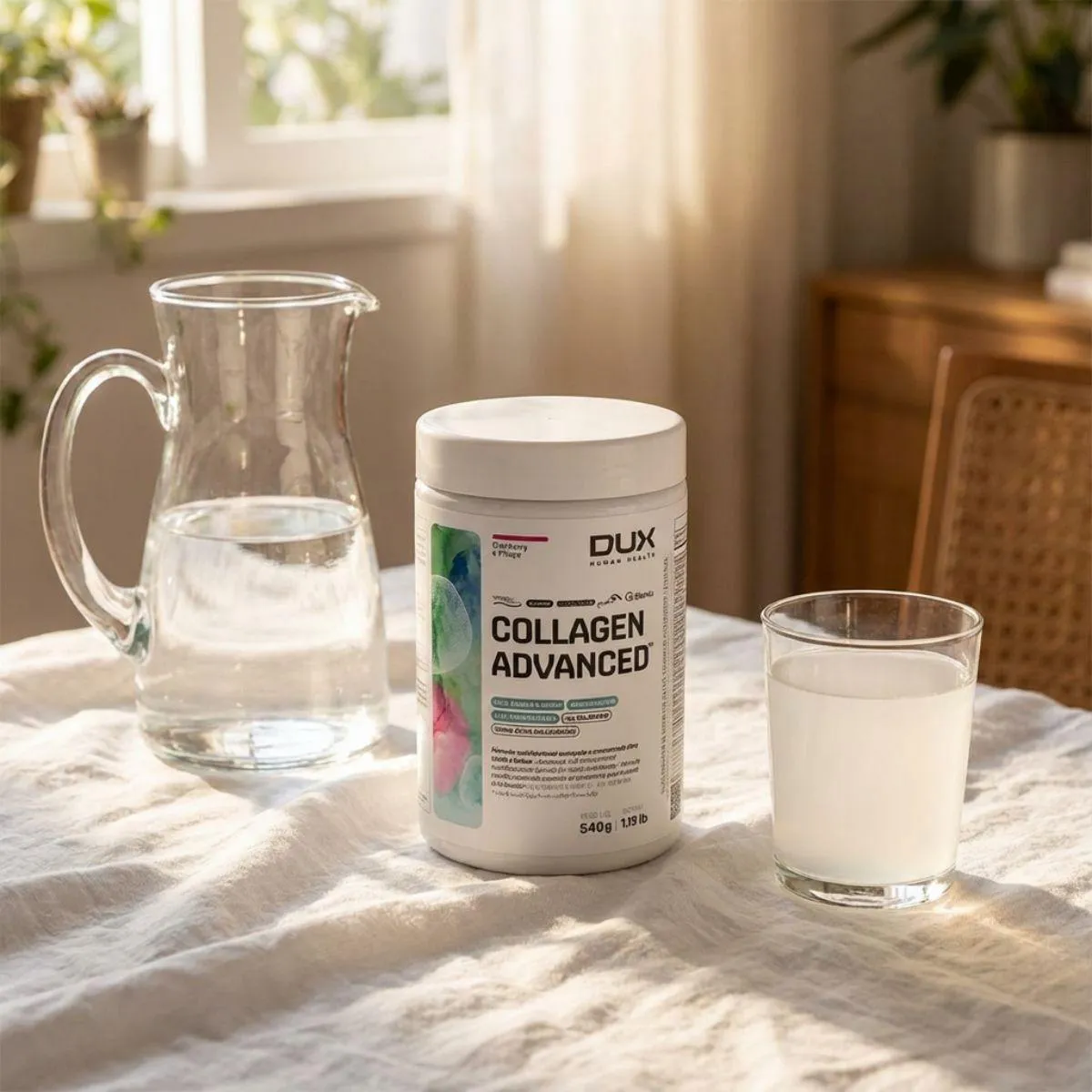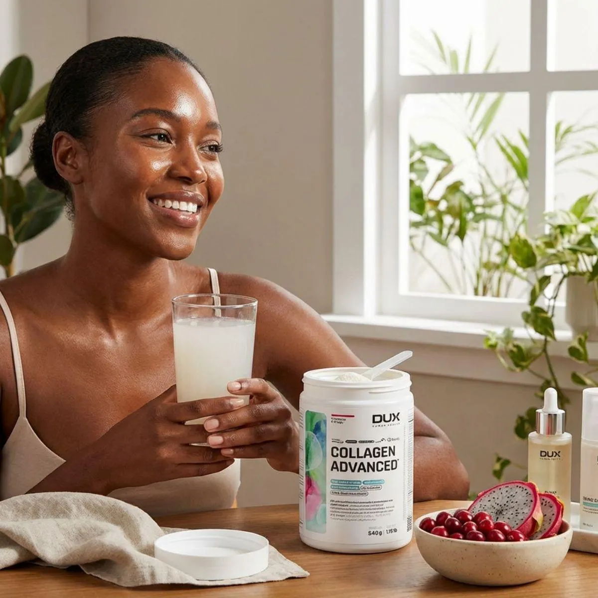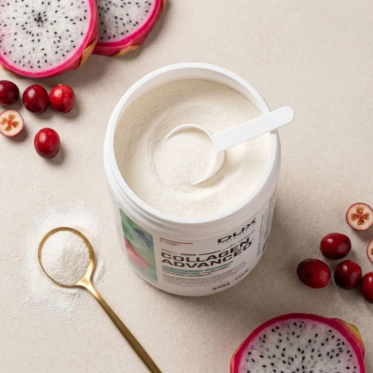 O Collagen Advanced MSM da Dux une peptídeos de colágeno hidrolisado a MSM (metilsulfonilmetano) e ácido hialurônico, proporcionando uma fórmula completa para cuidados com a pele e articulações. Também inclui vitamina C e biotina, nutrientes que participam da formação de colágeno e queratina. O suplemento não contém açúcar, glúten ou lactose.