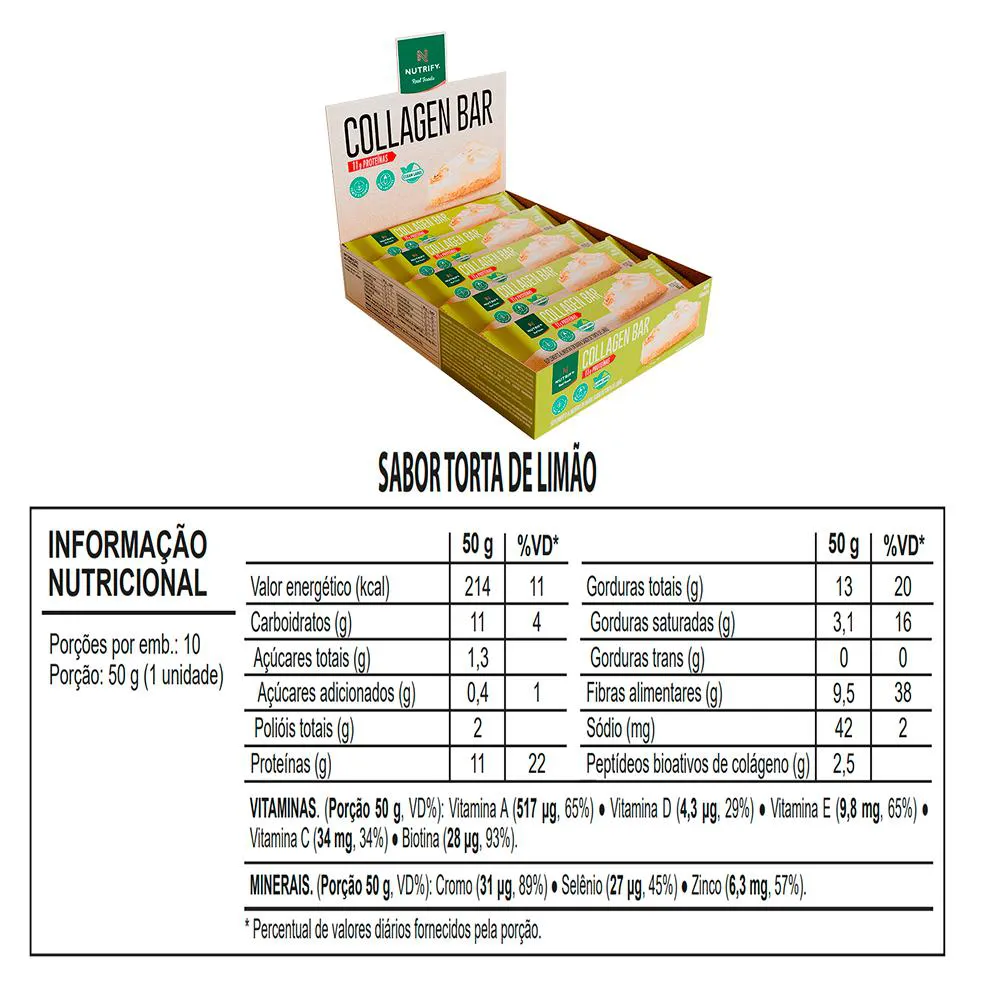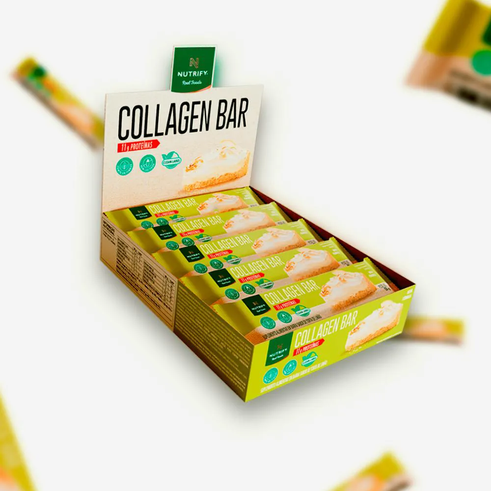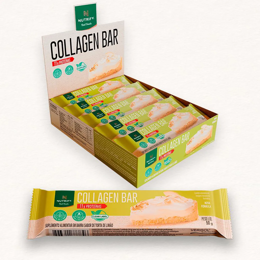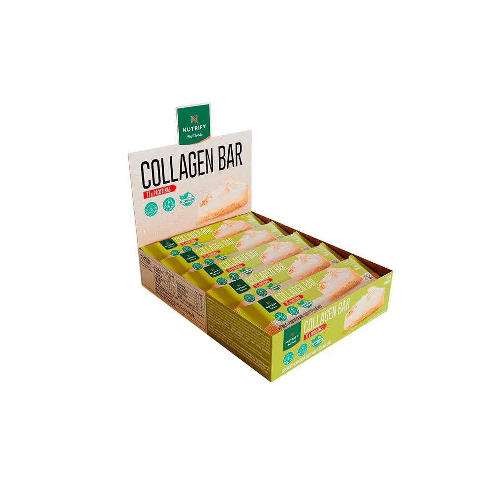 Collagen Bar Nutrify barra de proteína Torta de Limão 10und Collagen Bar é uma barrinha proteica formulada com colágeno hidrolisado, ideal para complementar a ingestão diária de proteínas de forma prática. É fonte de fibras e fornece 2,5 g de peptídeos bioativos de colágeno Verisol® por porção, além de conter vitaminas como A e D. Possui perfil nutricional equilibrado e não contém aditivos artificiais. SABOR TORTA DE LIMÃO