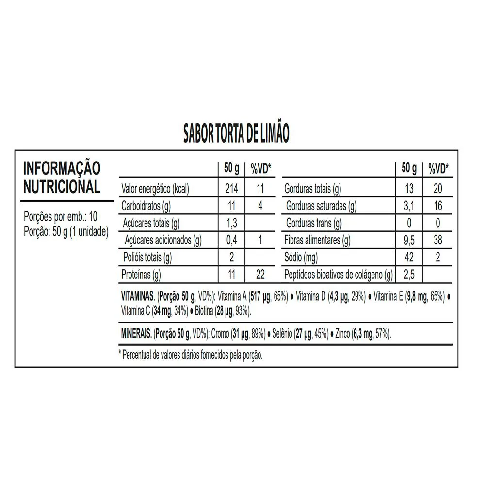 INGREDIENTES: Farinha de amêndoas, xarope de polidextrose, cobertura sabor chocolate branco sem açúcar, colágeno hidrolisado, peptídeos bioativos de colágeno hidrolisado com peso molecular médio de 2kDa (Verisol®), creme de avelã, fibra goma acácia (Acacia senegal L.), triglicerídeos de cadeia média, mix de vitaminas e minerais (ácido ascórbico, acetato de DL-alfatocoferila, sulfato de zinco monoidratado, acetato de retinol, picolinato de cromo, selenito de sódio, D-biotina e colecalciferol), aromatizantes, emulsificante lecitina, edulcorante glicosídeos de esteviol de Stevia rebaudiana Bertoni e antioxidante dl-alfa-tocoferol. ALÉRGICOS: Contém amêndoa e avelã. Pode conter amendoim, castanha-de-caju, castanha-do-pará e nozes.
