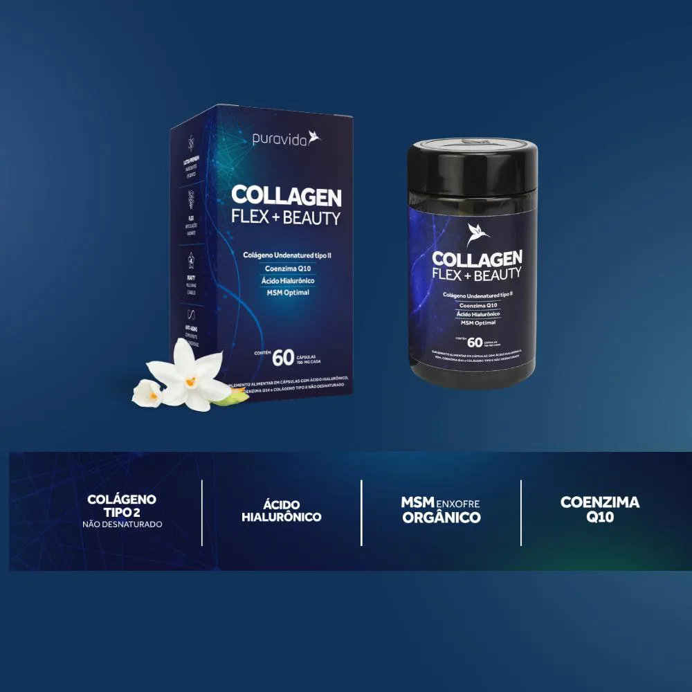 Além do colágeno tipo 2 com ácido hialurônico, que é o mais eficiente hidratante de tecidos que você pode suplementar, o Collagen Flex Beauty traz mais elementos fundamentais em cada cápsula como a Coenzima Q10, metilsulfonilmetano (MSM) entre outros.