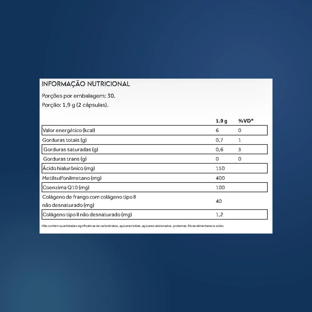 COMPOSIÇÃO: Óleo de coco, cápsula (gelatina, água purificada, umectante glicerina e corantes naturais curcumina e clorofilina cúprica), metilsulfonilmetano (MSM), hialuronato de sódio obtido pela fermentação de Streptococcus zooepidemicus, coenzima Q10, colágeno de frango com colágeno tipo II não desnaturado e emulsificante lecitina de girassol.