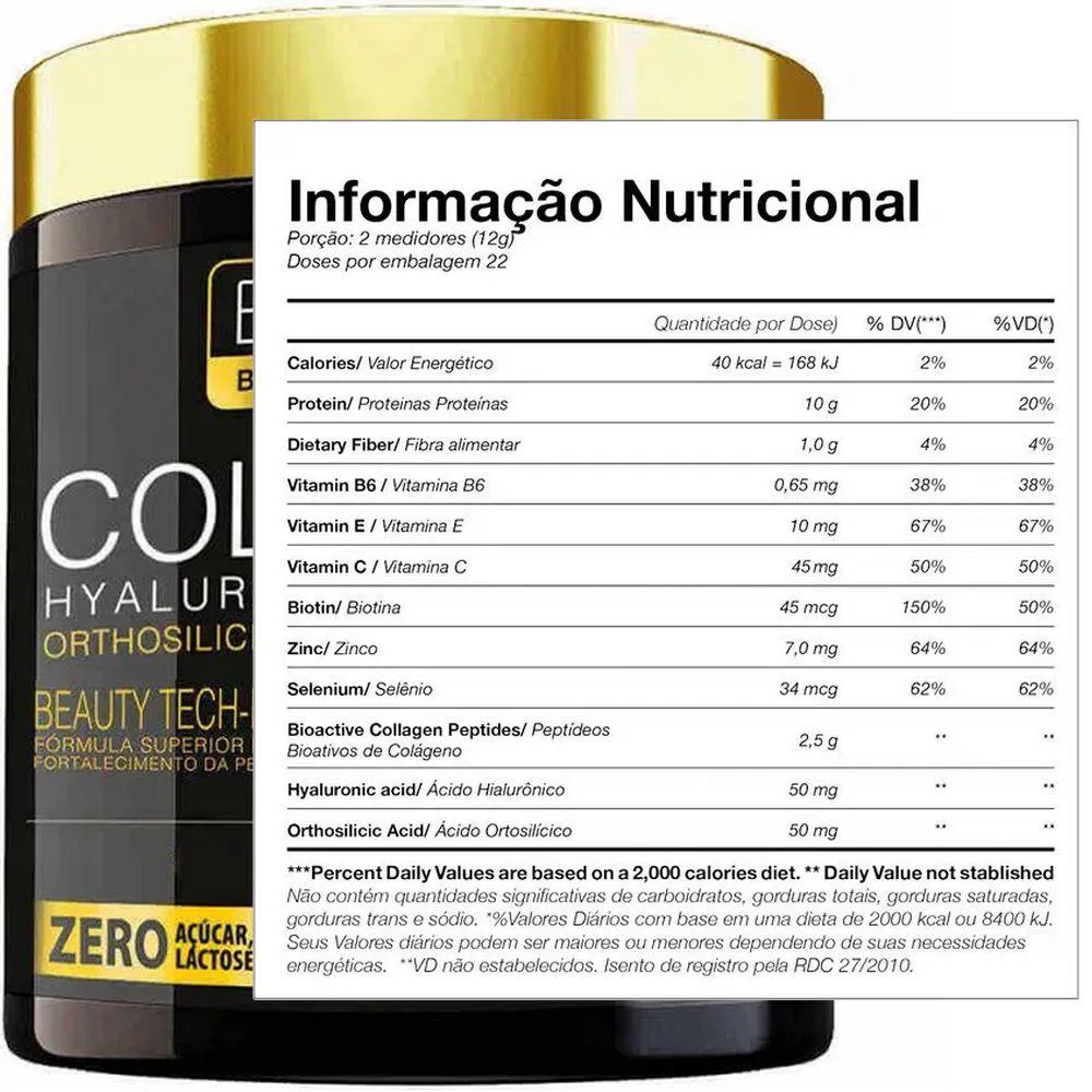 Limão: Colágeno peptídico, peptídeos bioativos de colágeno hidrolisado com peso molecular médio de 2kDa(Verisol), polidextrose, mix de vitaminas (óxido de zinco, ácido ascórbico, acetato de D-alfa-tocoferol, selenometionina, D-biotina), hialuronato, ácido ortosilícico estabilizado em cloreto de colina, cloridrato de piridoxina, rosas gálicas, acidulantes ácido cítrico e málico, aromatizantes, corante clorofilina, antiumectante dióxido de silício e edulcorante glicosídeos de esteviol.