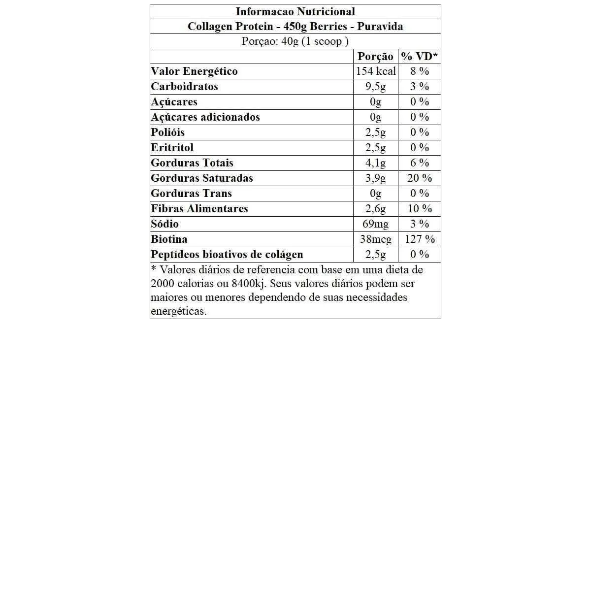 Colágeno hidrolisado, leite de coco, peptídeos bioativos de colágeno hidrolisado com peso molecular médio de 2KDA (Verisol), morango, framboesa, amora, d-biotina (vitamina B7), edulcorantes: eritritol e taumatina, espessantes: goma guar e xantana, aroma natural e antiumectante dióxido de silício.