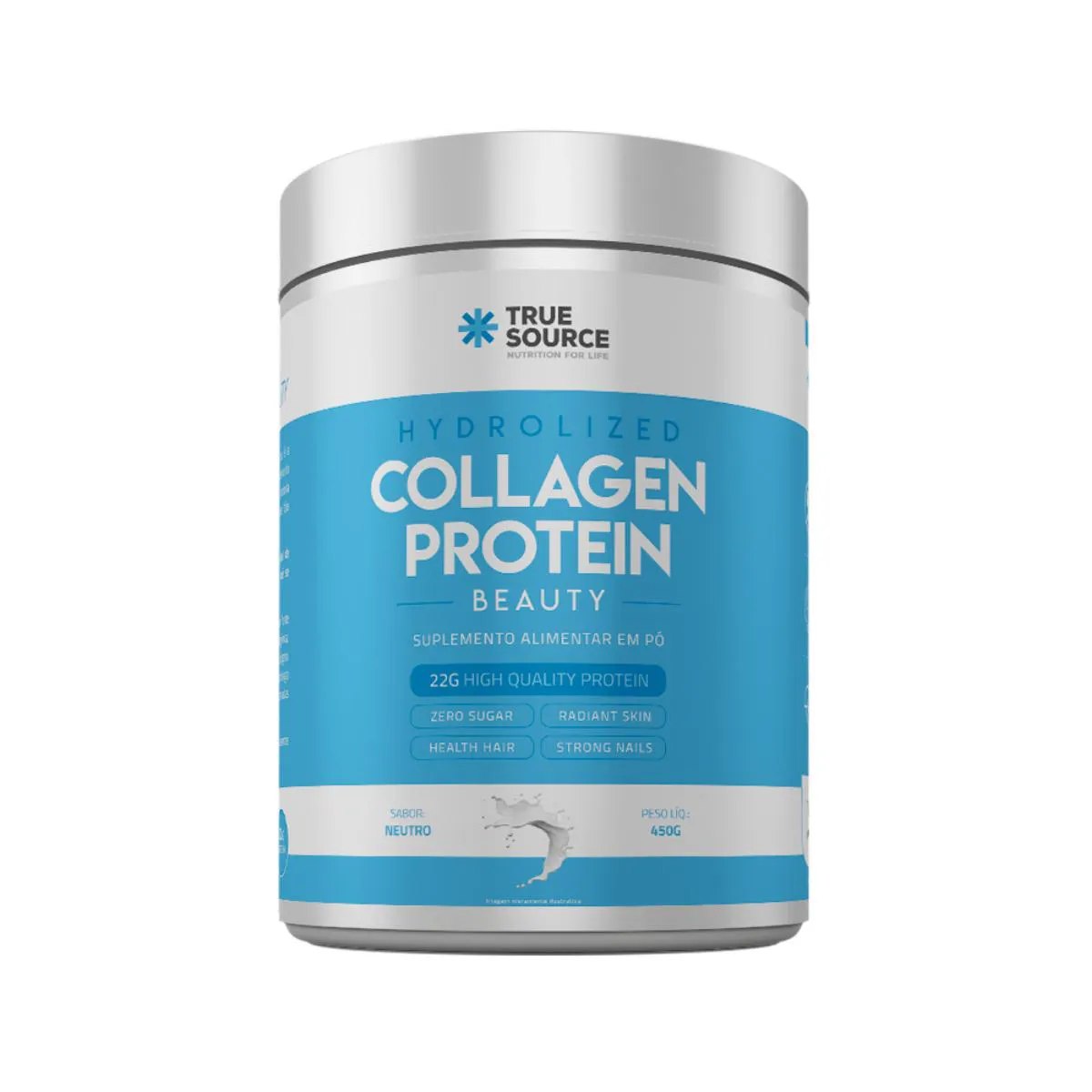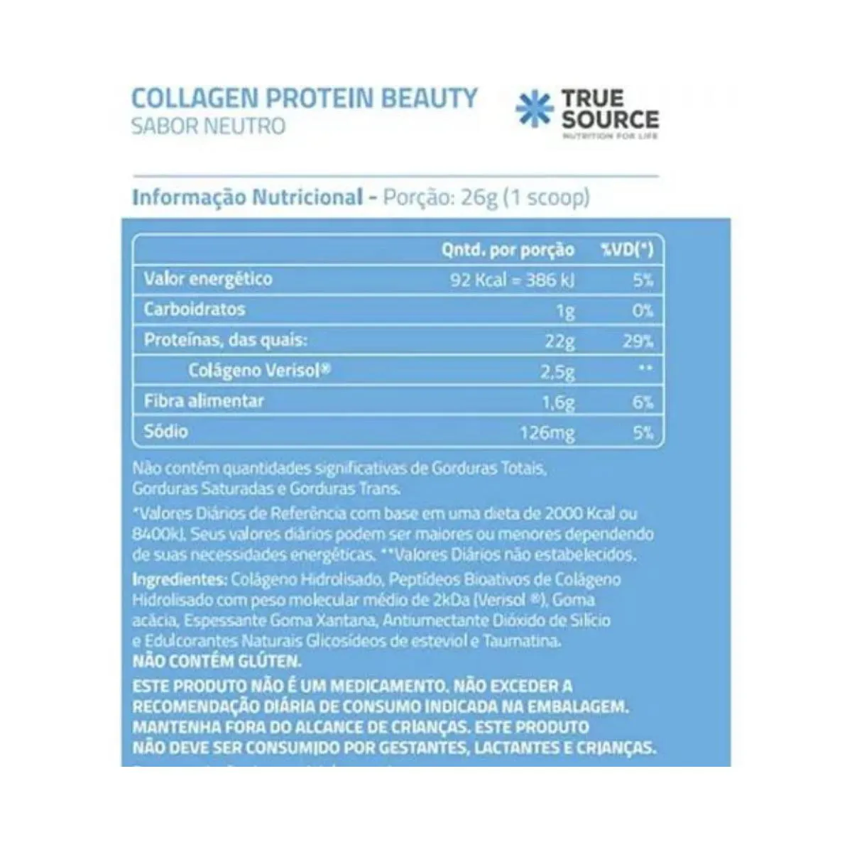 cientificamente sua eficácia nas camadas mais profundas da derme. Nosso colágeno tem como finalidade sua saúde, pois nós sabemos que para você sentir-se bem é necessário estar saudável. O Collagen Protein é limpo, puro e natural como todos os produtos da True Source. Potencialize a sua beleza, adeque seu consumo proteico, consuma True Collagen Protein. Sugestão de uso Adultos ≥ 19 anos: diluir 1 scoop (26g) em 200 ml de água gelada. Ingredientes: Colágeno hidrolisado, peptideos bioativos de colágeno hidrolisado com peso molecular médio de 2kDa (Verisol®), goma acácia, espessante goma xantana, antiumectante dióxido de silício e edulcorantes naturais glicosídeos de esteviol e taumatina.