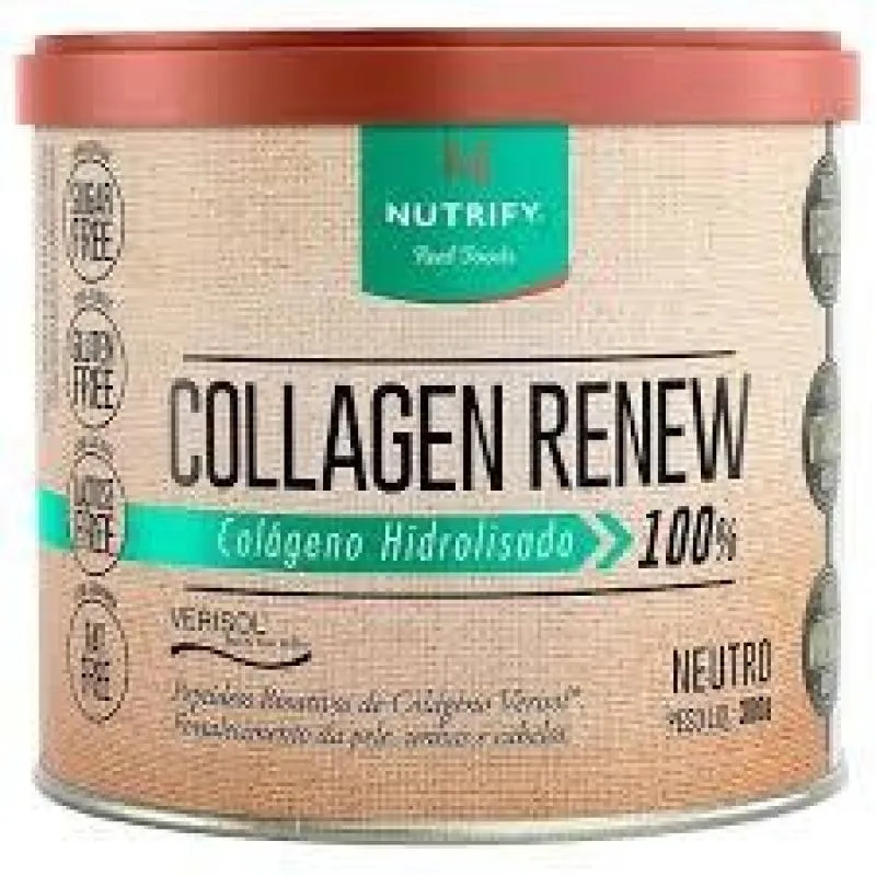 COLLAGEN RENEW VERISOL (300g) - NUTRIFY O Collagen Renew Nutrify contém peptídeos de colágeno acrescidos de 2,5 g de peptídeos bioativos de colágeno - VERISOL®. Esses peptídeos bioativos são obtidos por um processo tecnológico especial e patenteado, tornando-os específicos para estimular e restaurar o metabolismo das células dérmicas de dentro para fora. BENEFÍCIOS * Possui fórmula limpa, sem adição de açúcar, lactose, glúten, corantes e adoçantes artificiais;* Contém vitaminas e minerais antioxidantes que favorecem a absorção dos peptídeos bioativos de colágeno;* Promove o fortalecimento de pele, unhas e cabelo. Embalagem disponível: pote contendo suplemento em pó. Sabores: Limão, Laranja e Neutro. Peso líquido: 300g.