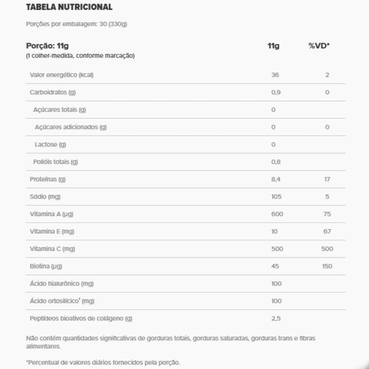 - Fórmula com colágeno, ácido hialurônico e vitaminas.