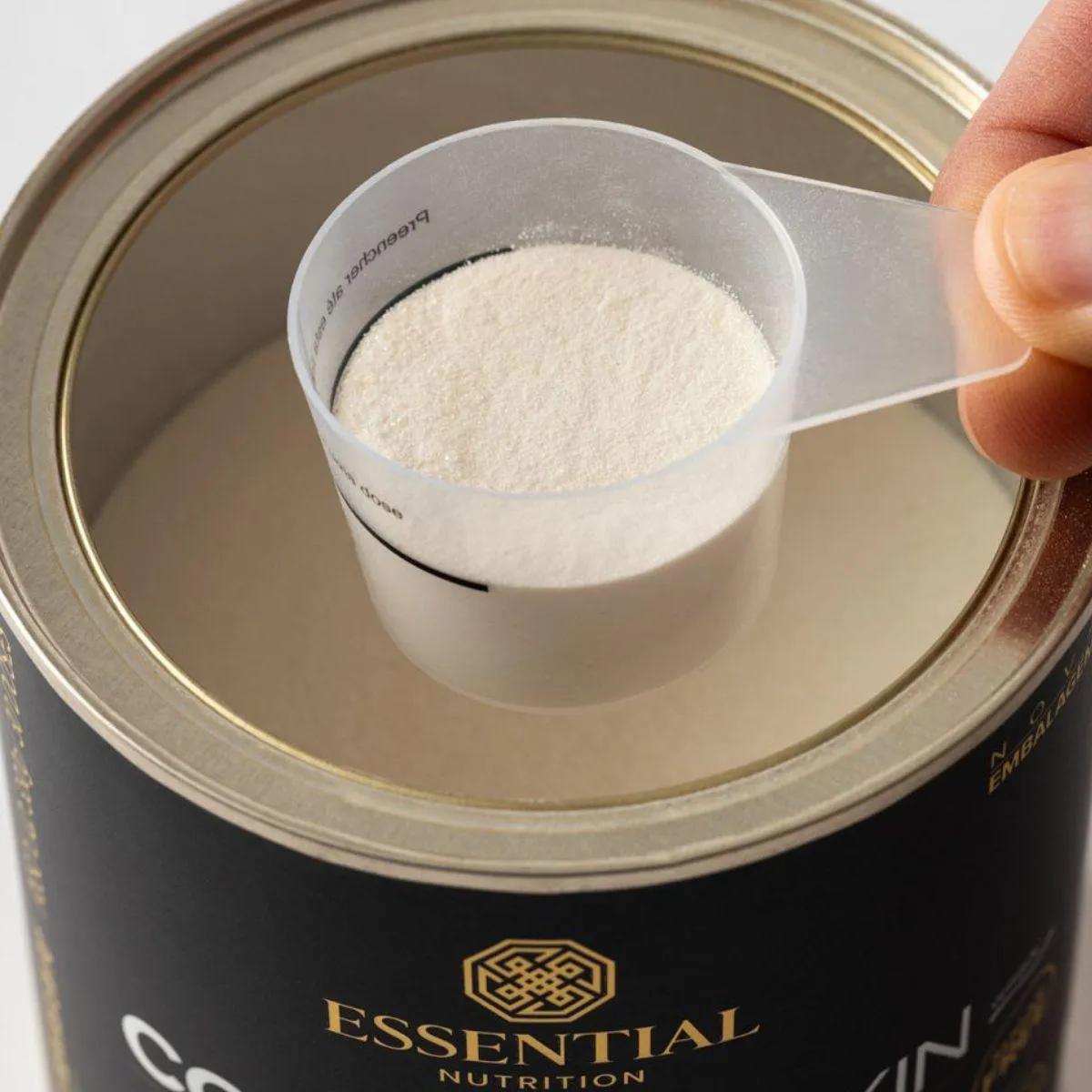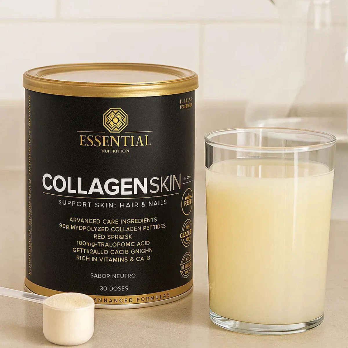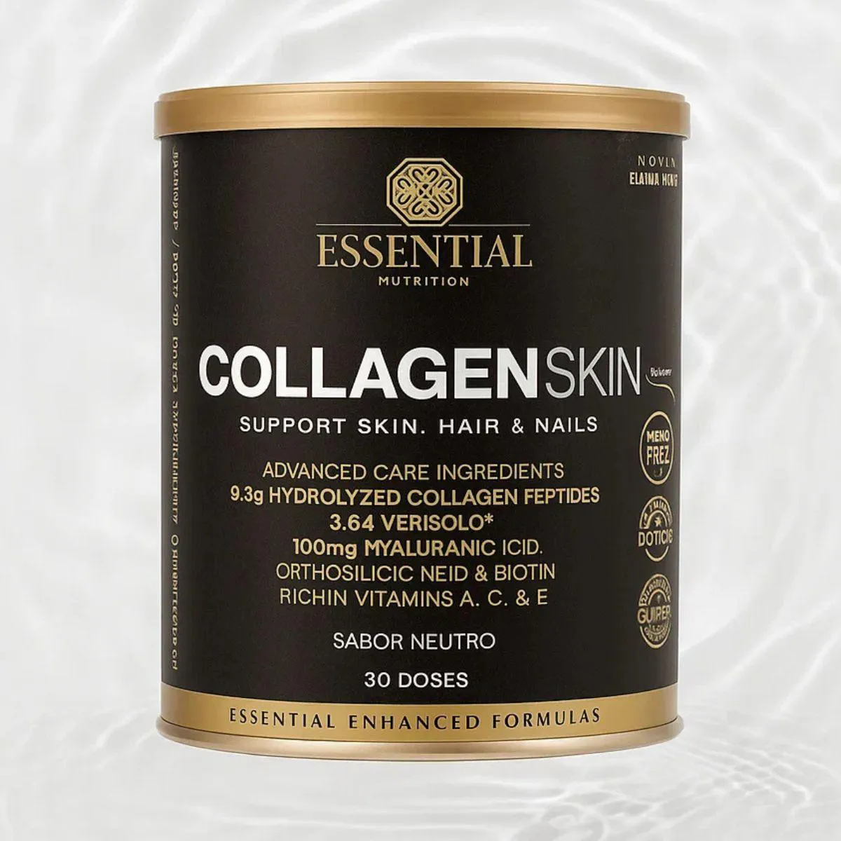 Collagen Skin da Essential Nutrition é um suplemento em pó de 330 g desenvolvido para pele, unhas e cabelos. Combina peptídeos de colágeno hidrolisado, ácido hialurônico, silício orgânico, vitaminas A, C, E, biotina e minerais em porções equilibradas.
