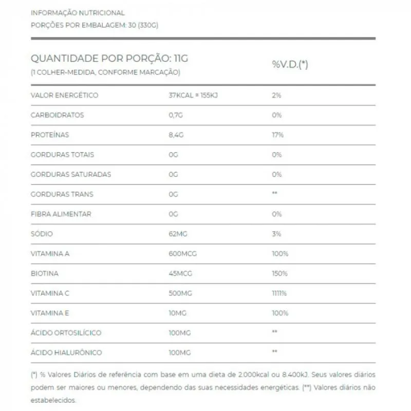 São 100mg de ácido hialurônico, combinado aos peptídeos de colágeno hidrolisado, ao ácido ortosilícico e a uma seleção de vitaminas fundamentais para a nutrição da pele, cabelos e unhas.