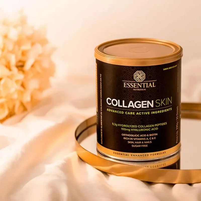 Collagen Skin, da Essential Nutrition é um produto em pó para preparo de bebida à base de colágeno hidrolisado, uma proteína que apesar de ser naturalmente produzida pelo nosso organismo, tem sua síntese reduzida gradualmente a partir dos 25 anos de idade. Uma vez que o colágeno e responsável por fornecer sustentação para diversos tecidos, como a pele, cabelos, unhas, músculos, ossos e articulações, sua deficiência favorece o surgimento de rugas e linhas de expressão, enfraquecimento ósseo, cabelos e unhas quebradiços, entre outros sinais. Desta forma, a suplementação pode ser uma boa alternativa.