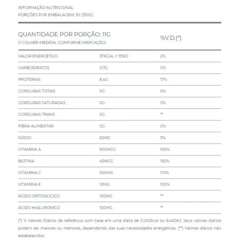 É enriquecido com ácido ortosílico e vitaminas E, C e A, que por sua vez estimulam a síntese de colágeno pelo nosso organismo;