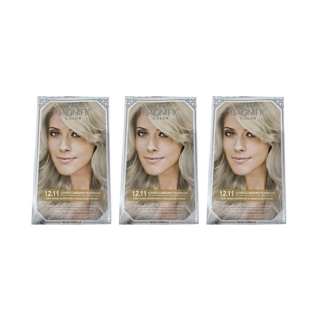 COLORAÇÃO AMEND MAGNIFIC CREME PERMANENTE 12.11 LOURO CLARO PLATINADO - KIT COM 3 UNIDADES Descrição A coloração Amend Magnific CR Permanente 12.11 Louro Clarissimo Platinado é um produto de coloração capilar permanente da marca Amend. Essa coloração foi desenvolvida para proporcionar um tom de loiro platinado intenso e duradouro aos cabelos. A fórmula da Coloração Amend Magnific CR contém ingredientes de alta qualidade que ajudam a garantir uma cor intensa e uniforme, além de conferir brilho e maciez aos fios. Essa coloração é conhecida por sua ação de longa duração, mantendo a cor vibrante por um período prolongado. O tom 12.11 representa um loiro claro intenso com reflexos acinzentados, também conhecido como loiro platinado. Essa tonalidade é ideal para quem deseja alcançar um visual sofisticado, moderno e elegante. Modo de uso