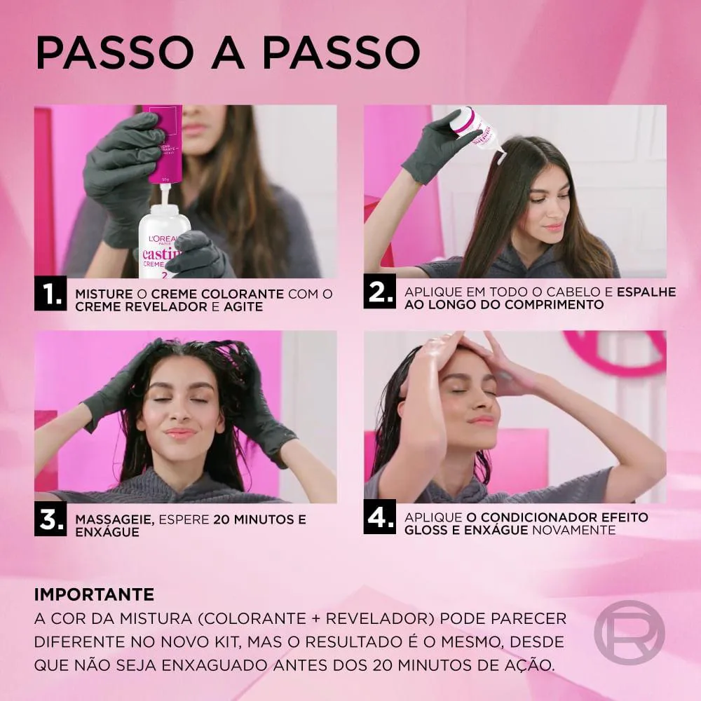 1- Para aplicar o Casting Creme Gloss da L'Oréal Paris: comece misturando o creme colorante no frasco aplicador do leite revelador;2- aplique nos cabelos secos não lavados;