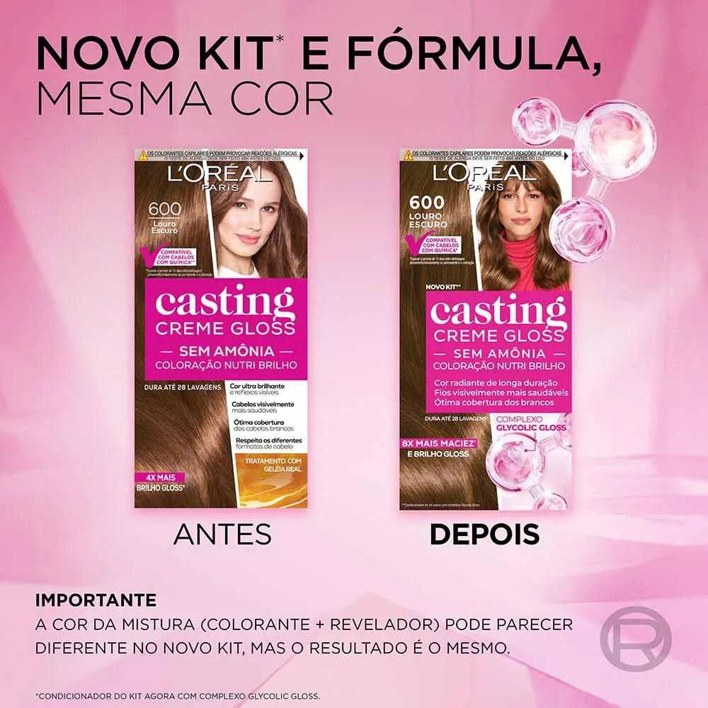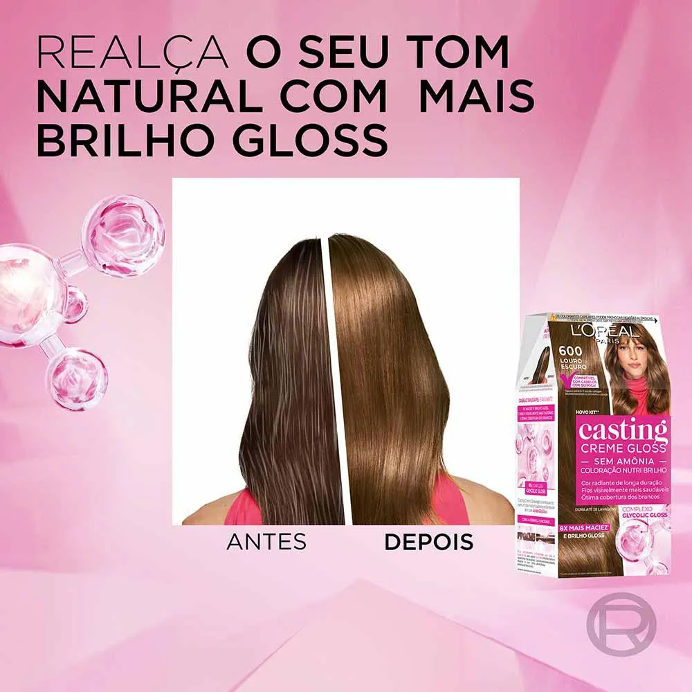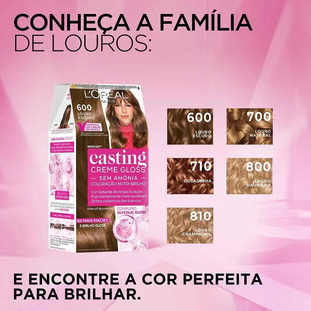 A Coloração Casting Creme Gloss L'Oréal Paris é uma solução inovadora para quem busca mudar a cor dos cabelos sem comprometer a saúde dos fios. Este produto oferece uma coloração sem amônia, proporcionando um brilho gloss irresistível e cuidando intensamente da fibra capilar. Ideal para aqueles que desejam realçar ou transformar sutilmente a cor natural do cabelo, este creme colorante garante resultados deslumbrantes sem ressecar os fios.Quais os benefícios da Coloração Casting Creme Gloss L'Oréal Paris?