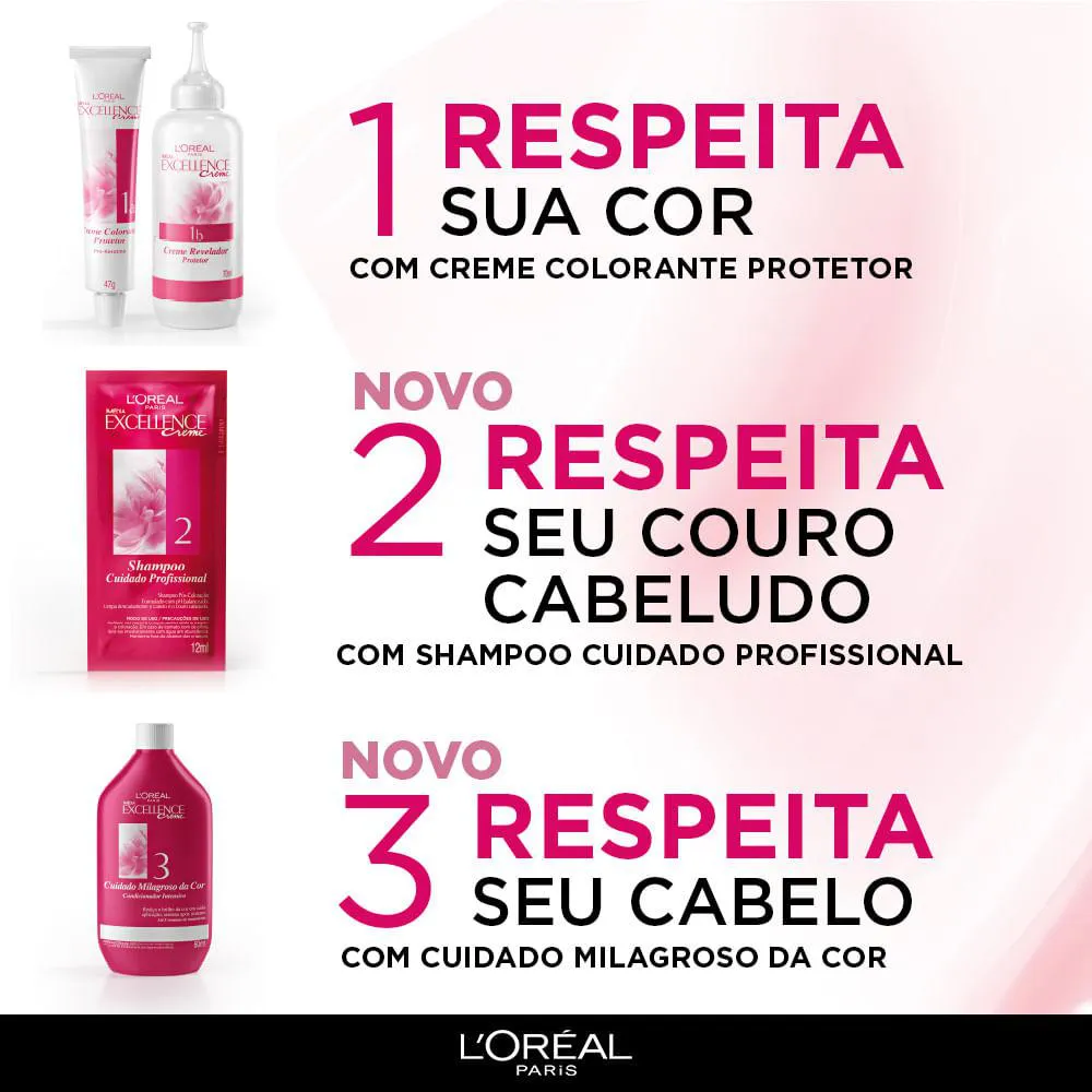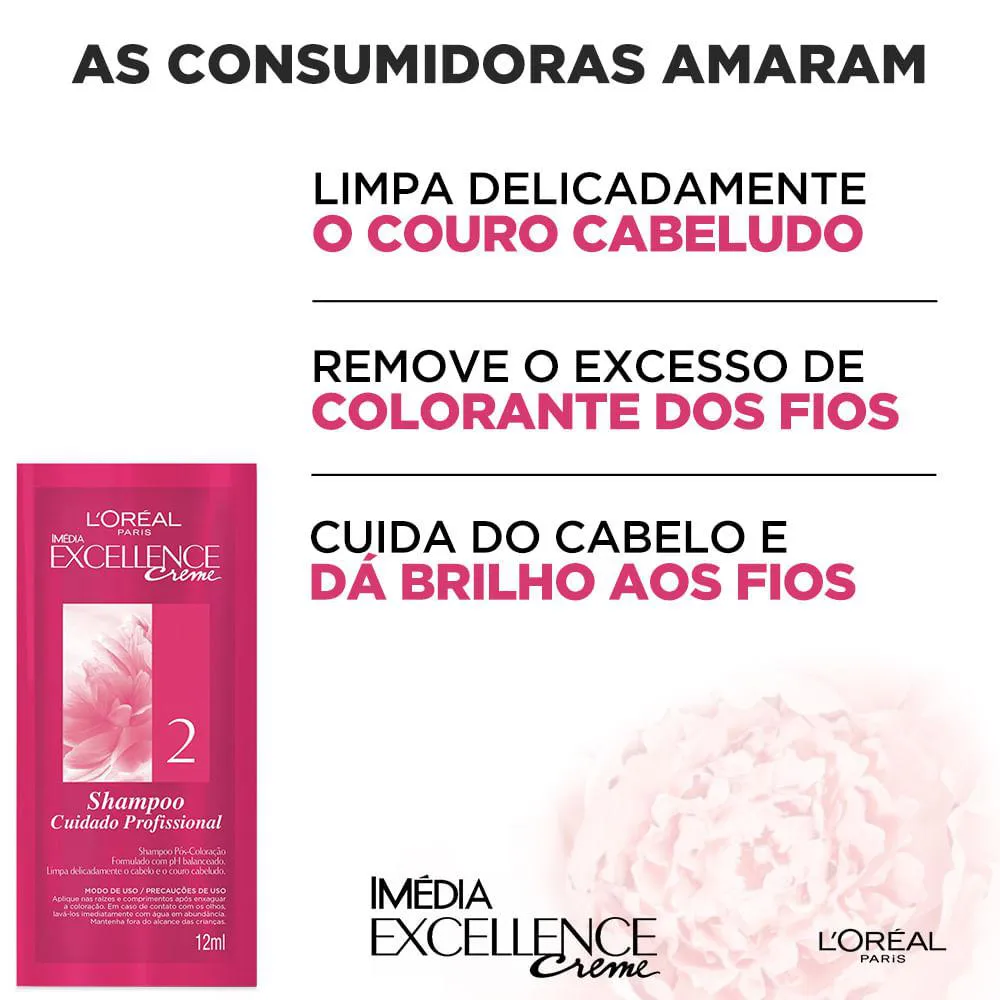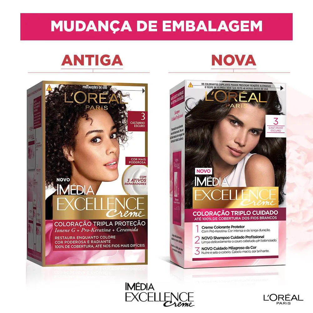 A Coloração Imédia Excellence é um produto de coloração permanente que oferece tripla proteção para os cabelos. Enriquecida com Ionene G, Pro-Keratina e Ceramida, a coloração restaura, fortalece e protege a fibra capilar enquanto cobre 100% dos fios brancos.