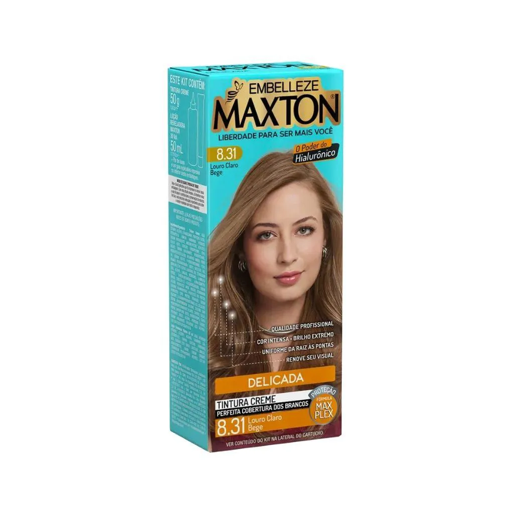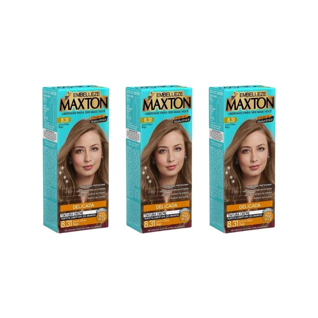COLORAÇÃO MAXTON 8.31 LOURO CLARO BEGE - KIT COM 3 UNIDADES Descrição A Coloração Maxton 8.31 Louro Claro Bege entrega um loiro claro sofisticado, com reflexos suaves dourados e acinzentados que juntos criam um efeito bege moderno, equilibrado e muito natural. Essa nuance é perfeita para quem busca um loiro iluminado, sem excesso de calor, com acabamento delicado e aparência refinada. Com fórmula cremosa de alta performance, Maxton garante cobertura total dos fios brancos, cor duradoura e resultado uniforme da raiz às pontas. Ao mesmo tempo em que colore, trata os fios, deixando-os macios, sedosos e com brilho radiante. Modo de uso