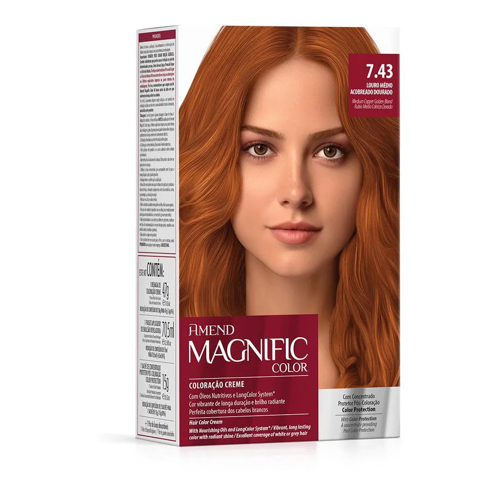 Amend - Kit Coloração Magnific Color 7.43 Louro Médio Acobreado Dourado Uma coloração em creme que possibilita cores vibrantes de longa duração e brilho radiante. Sua fórmula é enriquecida com Proteína do Arroz que possui efeito restaurador e protetor, ou seja, a cor dos seus cabelos é renovada e a estrutura capilar preservada. Perfeita cobertura dos cabelos brancos. - Proporciona brilho radiante;- Perfeita cobertura dos cabelos brancos;- Cabelos e cor protegidos por mais tempo. Sugestão de uso:Caso 1: Cabelos naturais, coloridos há mais de 3 meses ou coloridos com uma cor muito diferente (aplicação da coloração sobre todo o cabelo de uma só vez): 1 - Coloque as luvas descartáveis que acompanham este kit e inicie a aplicação da mistura pela raiz, nos cabelos secos. Faça uma linha ao longo da raiz e aplique a mistura mecha por mecha;2 - Aplique o restante da mistura sobre o comprimento e pontas. Massageie os cabelos até que a coloração esteja bem distribuída. Utilize toda a mistura para um bom resultado;3 - Deixe agir por 35 minutos. Para uma perfeita cobertura dos cabelos brancos deixe agir mais 5 minutos;4 - Jogue um pouco de água morna sobre os cabelos e massageie suavemente para emulsionar a coloração. Logo após, enxágue os cabelos com água abundante, retirando todo o produto até que a água esteja clara;5 - Retire o excesso d’água e aplique o Concentrado Protetor Pós-Coloração Color Protection. Massageie e deixe agir por 2 minutos. Enxágue bem e finalize como de costume. Caso 2: Cabelos já coloridos - Retoque de raiz (aplicação da coloração na raiz e logo após sobre o comprimento dos fios e pontas, evitando sobrecarga de cor ao longo dos fios já coloridos):1 - Coloque as luvas descartáveis que acompanham este kit e inicie a aplicação da mistura pela raiz, nos cabelos secos. Faça uma linha ao longo da raiz e aplique a mistura, ou seja, na parte crescida. Espalhe bem o produto pela raiz. Em seguida, separe o cabelo mecha por mecha, facilitando a aplicação do produto, até que toda a raiz esteja coberta pela mistura;2 - Deixe agir por 15 minutos. Em seguida, aplique o restante do produto por todo o cabelo e massageie para garantir uma boa distribuição, de forma homogênea. Utilize toda a mistura para um bom resultado;3 - Deixe agir por mais 20 minutos. Em cabelos com muitos fios brancos deixe agir por 5 minutos;4 - Jogue um pouco de água morna sobre os cabelos e massageie suavemente para emulsionar a coloração. Logo após, enxágue os cabelos com água abundante, retirando todo o produto até que a água esteja clara;5 - Retire o excesso d’água e aplique o Concentrado Protetor Pós-Coloração Color Protection. Massageie e deixe agir por 2 minutos. Enxágue bem e finalize como de costume. O que você está comprando!Kit Coloração Magnific Color Amend 7.43 Louro Médio Acobreado Dourado contendo:01 - Bisnaga de Coloração Creme - 47g e/ 1.65oz;01 - Frasco Aplicador de Emulsão Reveladora 70,5 ml e/ 2.38 fl.oz;01 - Sachê de Concentrado Protetor Pós Coloração Color Protection 15g e/ 0.52oz;01 - Par de Luvas Descartáveis;01 - Folheto explicativo impresso na parte interna da embalagem. ANVISA