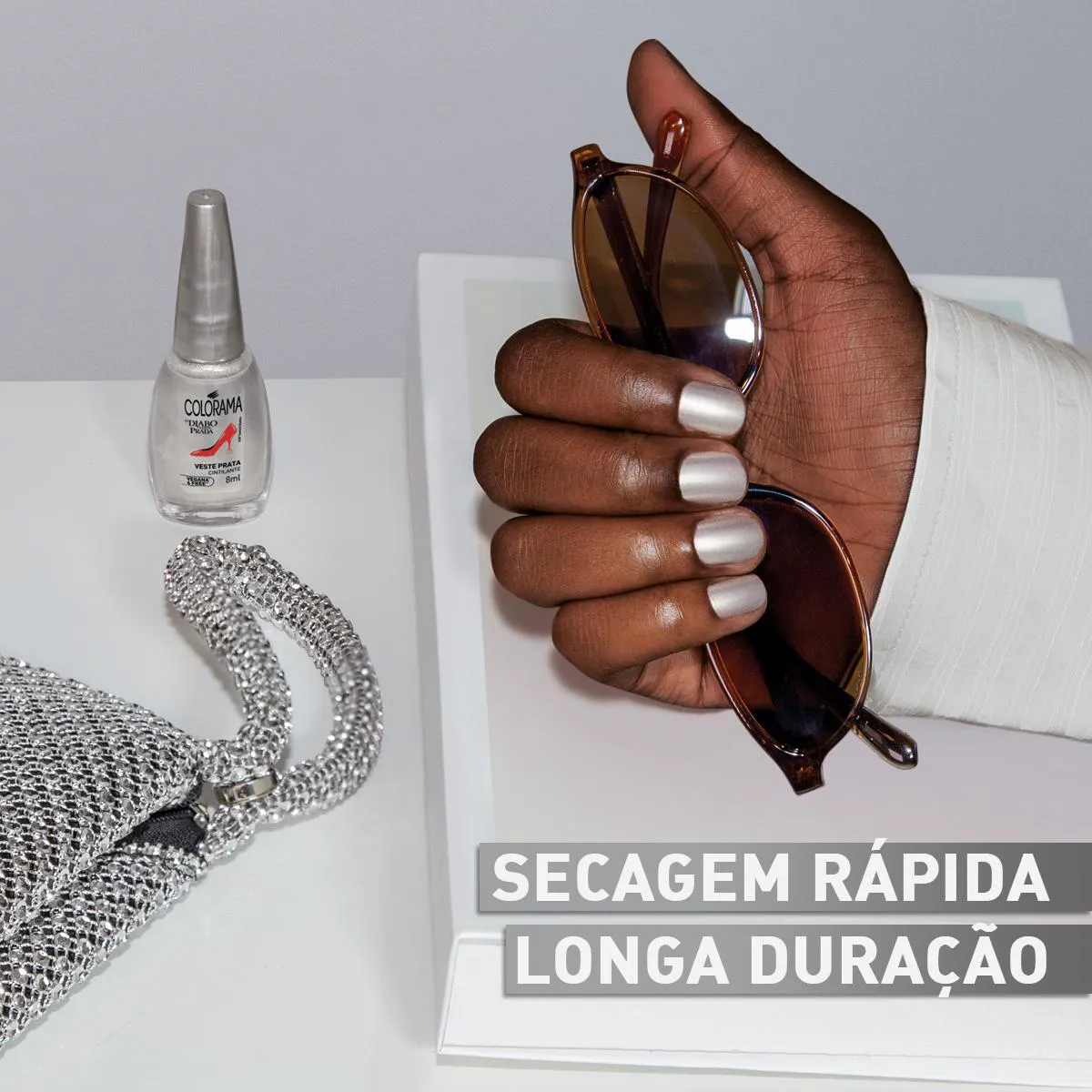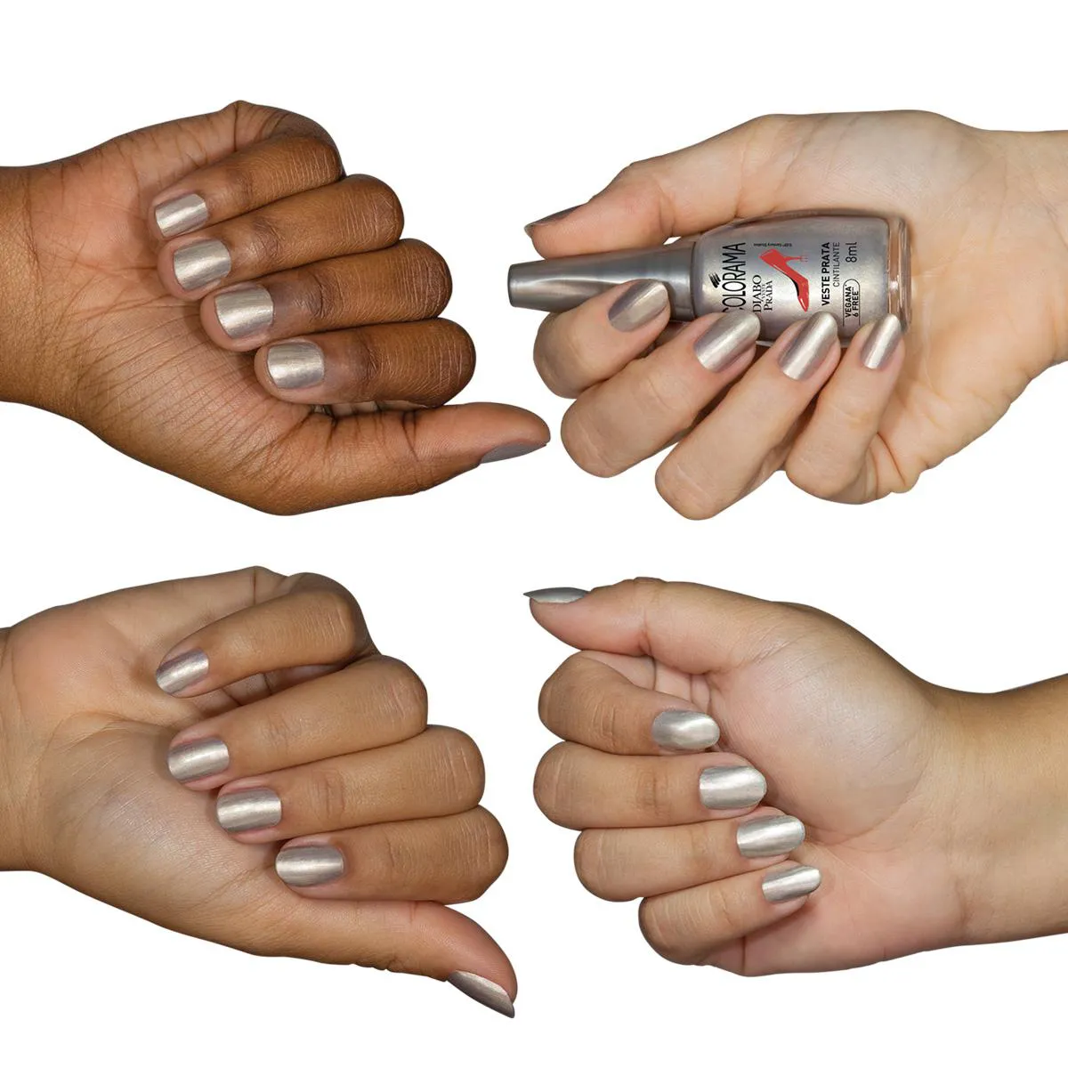 Além disso, o Esmalte Cremoso Colorama Diabo Veste Prada Veste Prata possui fórmula vegana e 6 free, sendo livre de seis dos principais componentes associados a alergias. O produto também é dermatologicamente testado, garantindo mais segurança durante o uso.