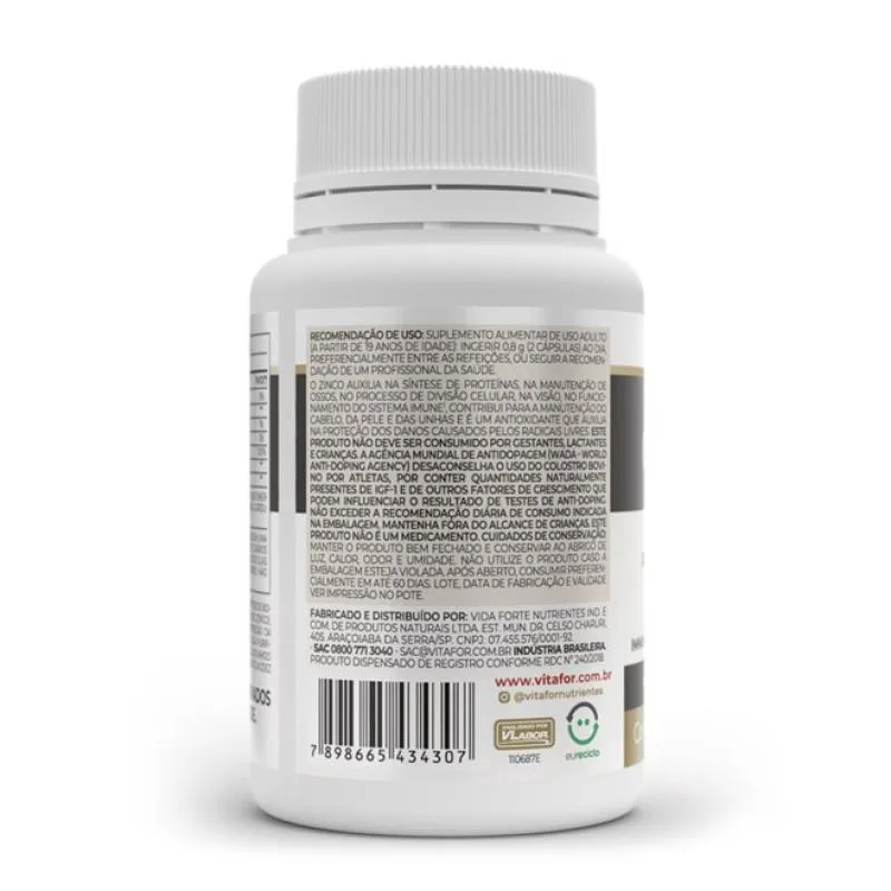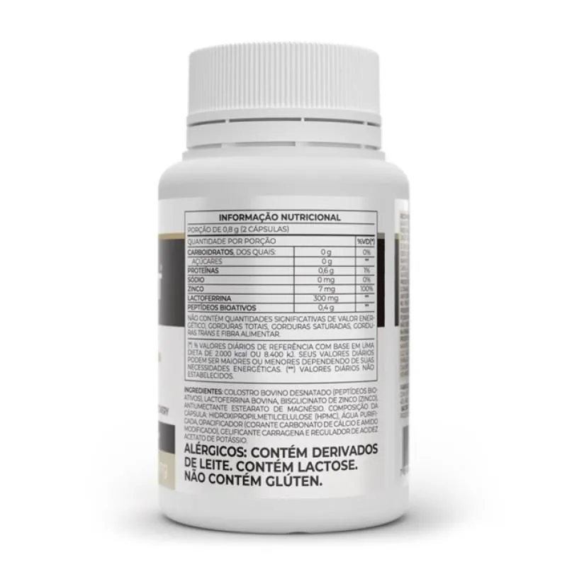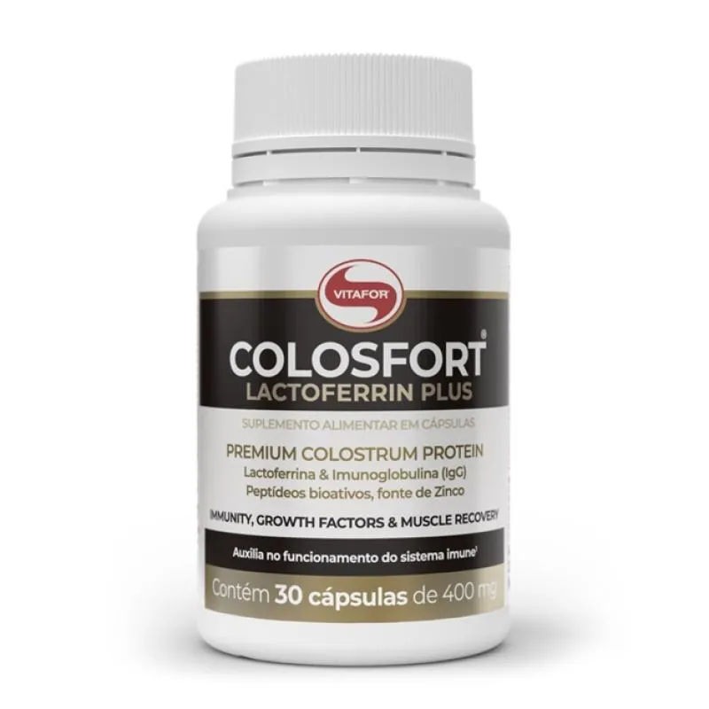 Colosfort Lactoferrin Plus (30 caps) COLOSFORT LACTOFERRIN PLUS é um suplemento alimentar à base de peptídeos bioativos de colostro bovino, lactoferrina bovina e mineral zinco. Confira abaixo seus benefícios e diferenciais. Benefícios:- Fonte de peptídeos bioativos de colostro bovino e lactoferrina bovina;- Fonte de Zinco que auxiliam: na síntese de proteínas, na manutenção de ossos, no processo de divisão celular e na visão, no funcionamento do sistema imune, contribui para a manutenção do cabelo, da pele e das unhas, antioxidante que auxilia na proteção dos danos causados pelos radicais livres. Diferenciais:- Fórmula Inovadora;- Selecionamos a melhor e a mais segura matéria prima do mercado;- 400 mg de peptídeos bioativos de colostro por porção;- 300 mg de lactoferrina por porção- 100% da IDR de Zinco por porção;- Praticidade no formato cápsula.