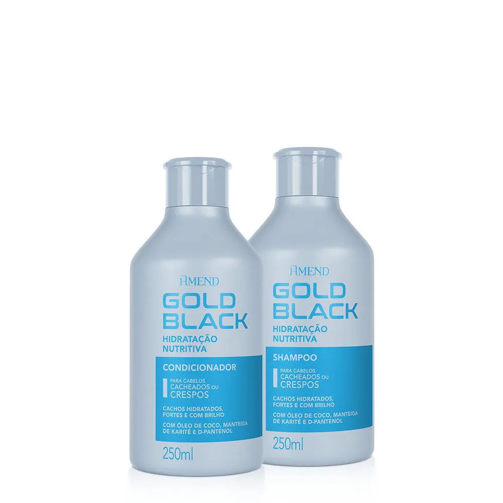 shampoo Amend Gold Black Hidratação Nutritiva O Shampoo Gold Black Hidratação Nutritiva foi desenvolvido para cuidar dos cabelos cacheados ou crespos e limpa suavemente sem agredir os fios. Sua fórmula combina ativos com alto poder de hidratação, nutrição e reparação, que reduzem a formação de pontas duplas, fortalecem o cabelo, e aumentam o brilho, a maciez e a maleabilidade dos fios. Livre de Parabenos, Silicones, Petrolatos e Corantes. Dermatologicamente testado.