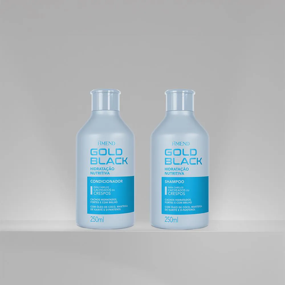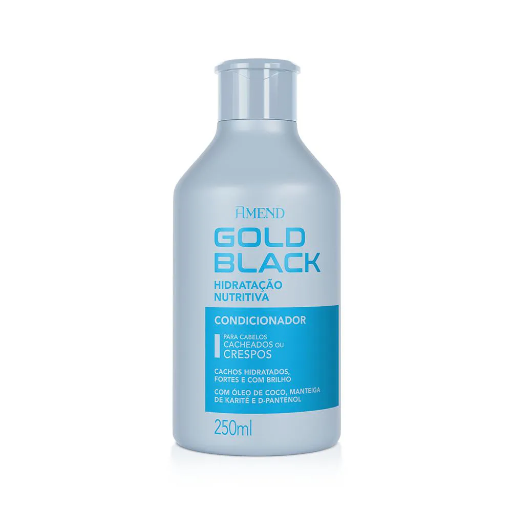 condicionador Amend Gold Black Hidratação Nutritiva O Condicionador Gold Black Hidratação Nutritiva foi desenvolvido para cuidar dos cabelos cacheados ou crespos e proporciona condicionamento intenso. Sua fórmula combina ativos com alto poder de hidratação, nutrição e reparação, que reduzem a formação de pontas duplas, fortalecem o cabelo, e aumentam o brilho, a maciez e a maleabilidade dos fios. Livre de Parabenos, Silicones e Corantes. Dermatologicamente testado.