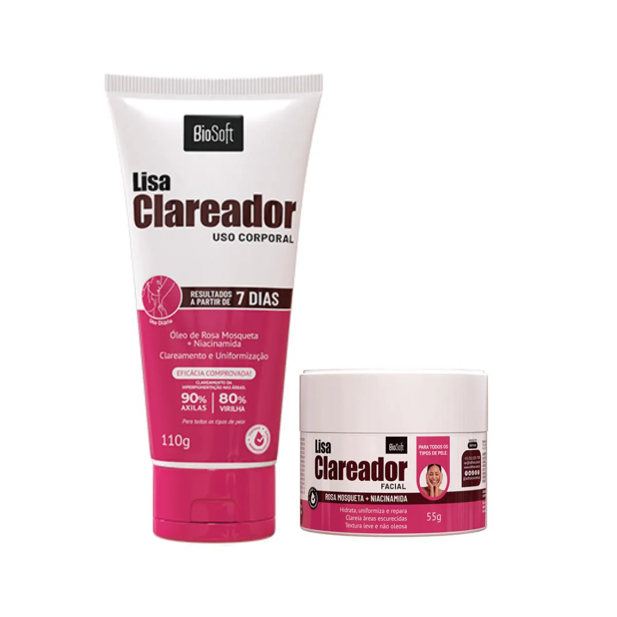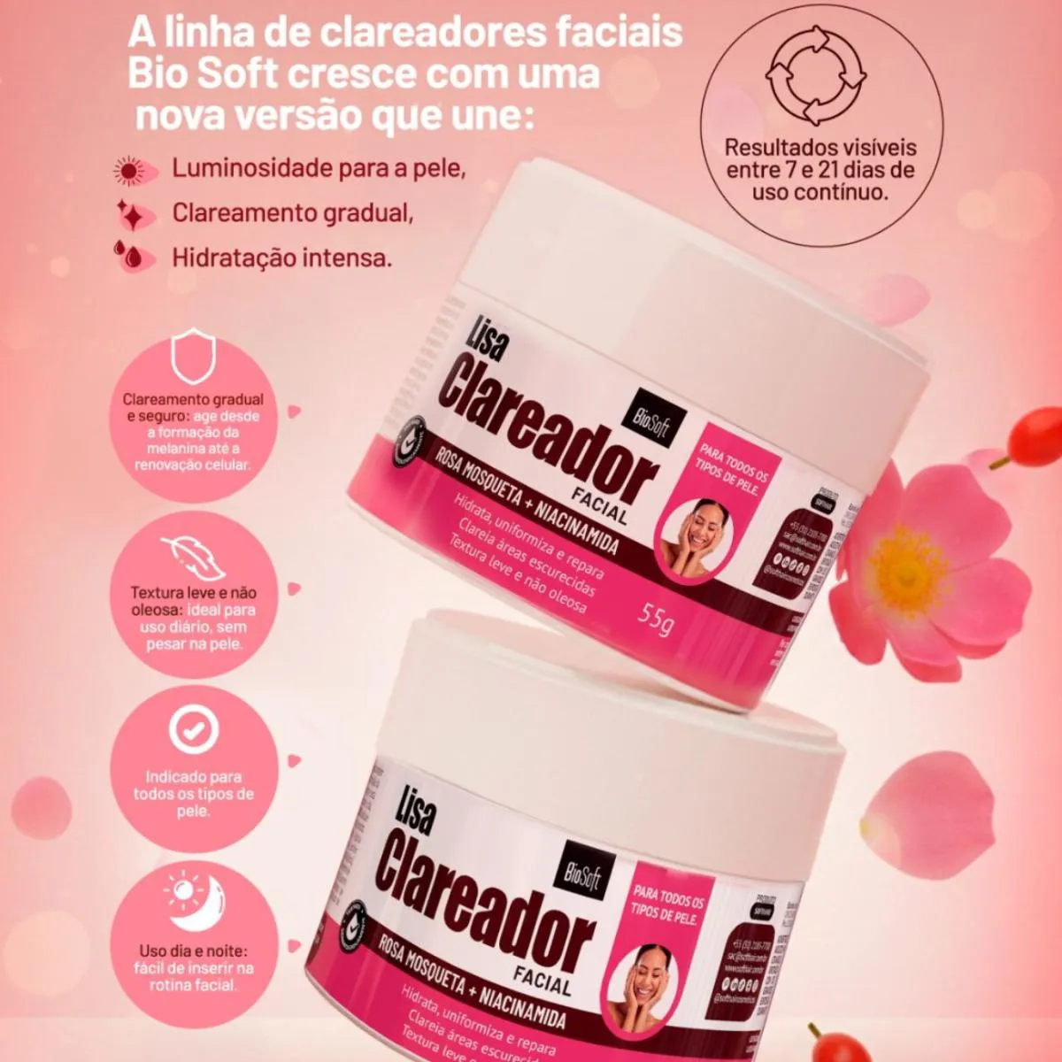 clareador facial, clareador corporal, rosa mosqueta, niacinamida, bio soft, lisa clareador, tirar manchas axila, clarear virilha, creme para manchas, clareamento gradual, kit skin care, tratamento hiperpigmentação, clareador de manchas, cuidado com a pele, kit beleza, clareador bisnaga, uniformizar tom da pele, clareador íntimo, creme facial clareador, óleo de rosa mosqueta.