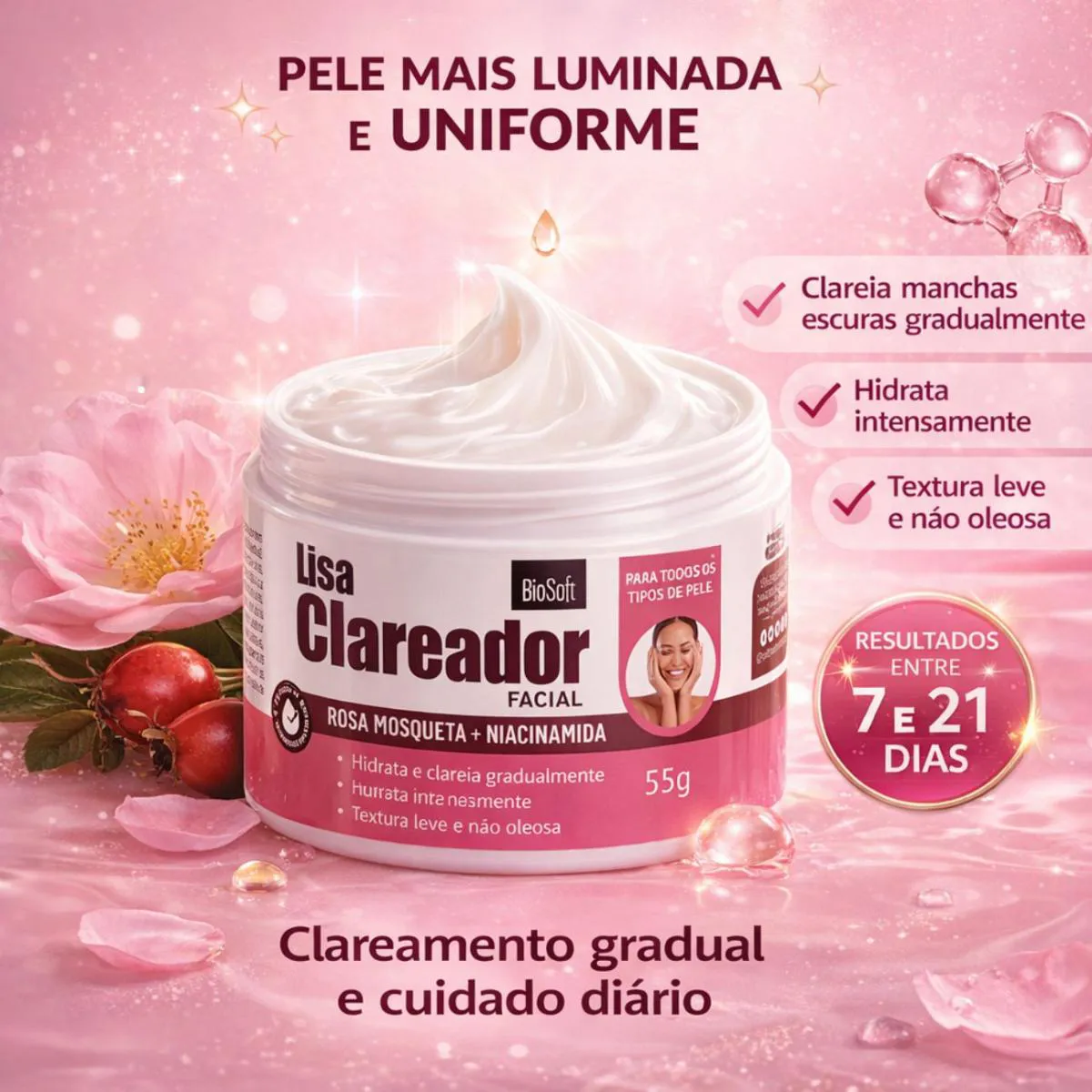 Lisa Clareador Facial (55g): Desenvolvido para devolver o viço e a luminosidade ao rosto. Atua na renovação celular e uniformização do tom, com resultados visíveis entre 7 e 21 dias. Possui textura leve, não oleosa e é indicado para todos os tipos de pele.