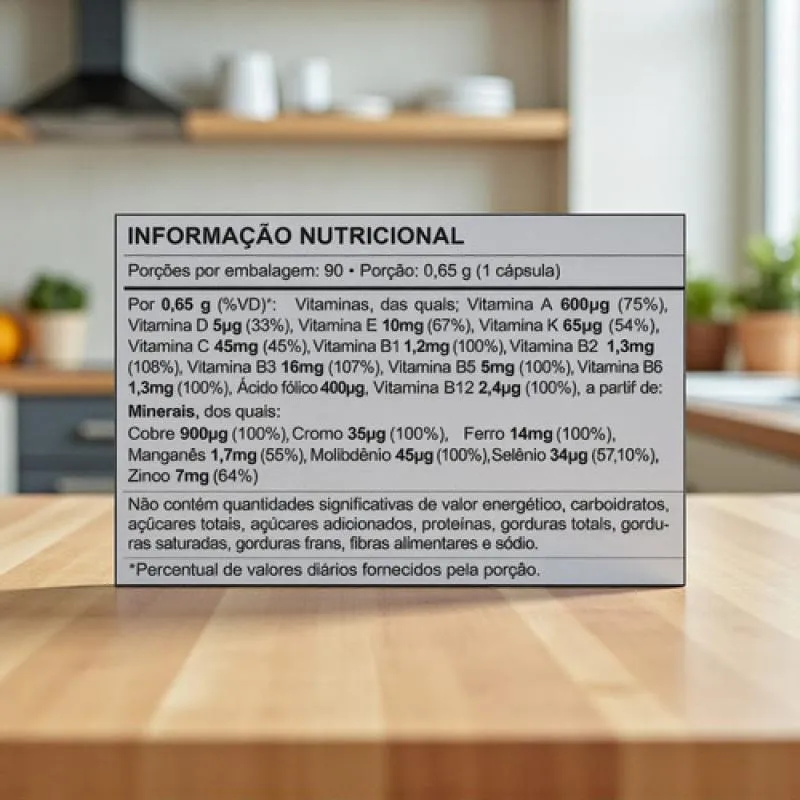 Suplemento alimentar em cápsulas softgel, formulado com vitaminas e minerais para uso diário.