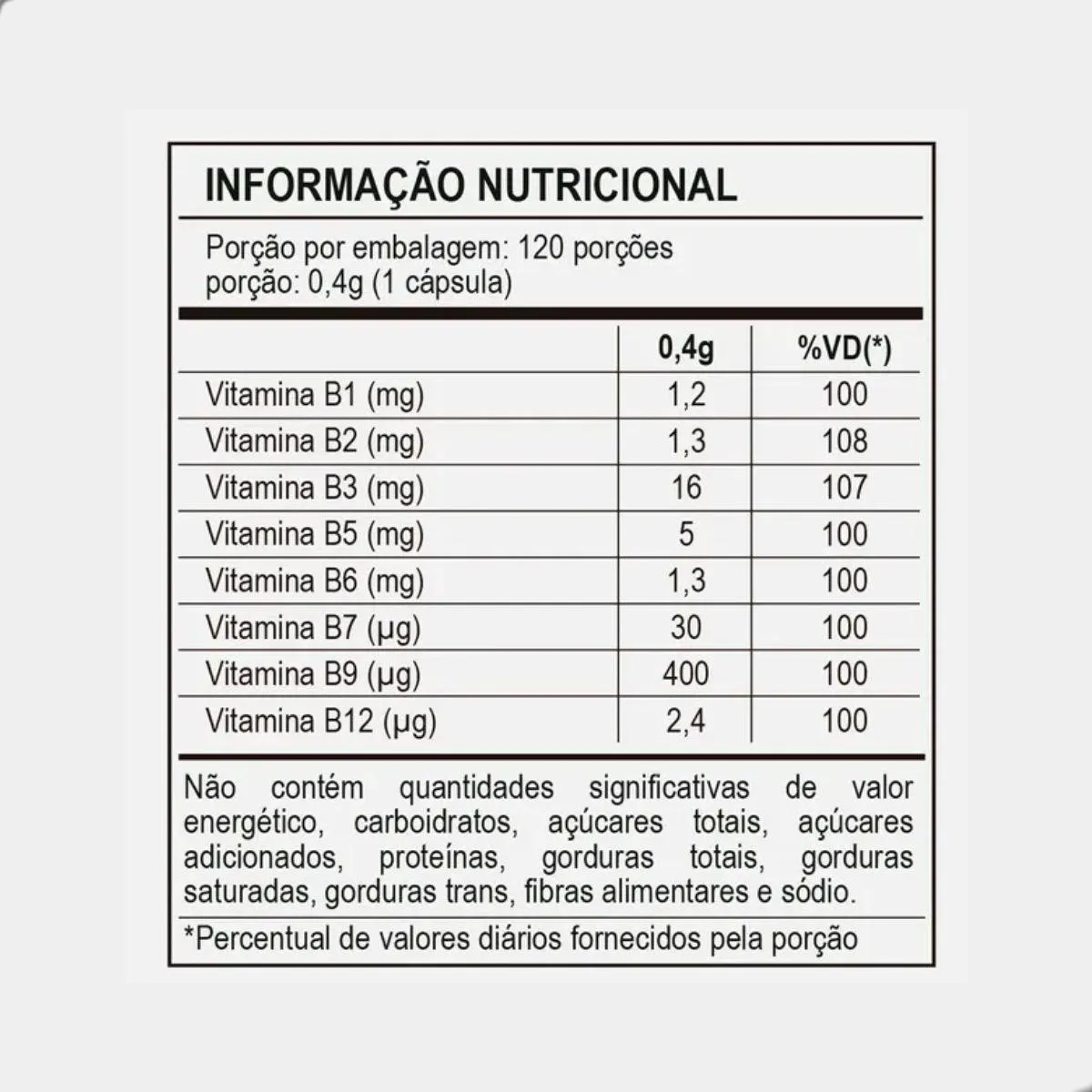 Sua composição contém vitaminas B1, B2, B3, B5, B6, B7, B9 e B12 em formas ativas; livre de glúten e lactose. e não inclui componentes de origem animal ou alergênicos comuns, adaptando-se a diferentes estilos de vida.