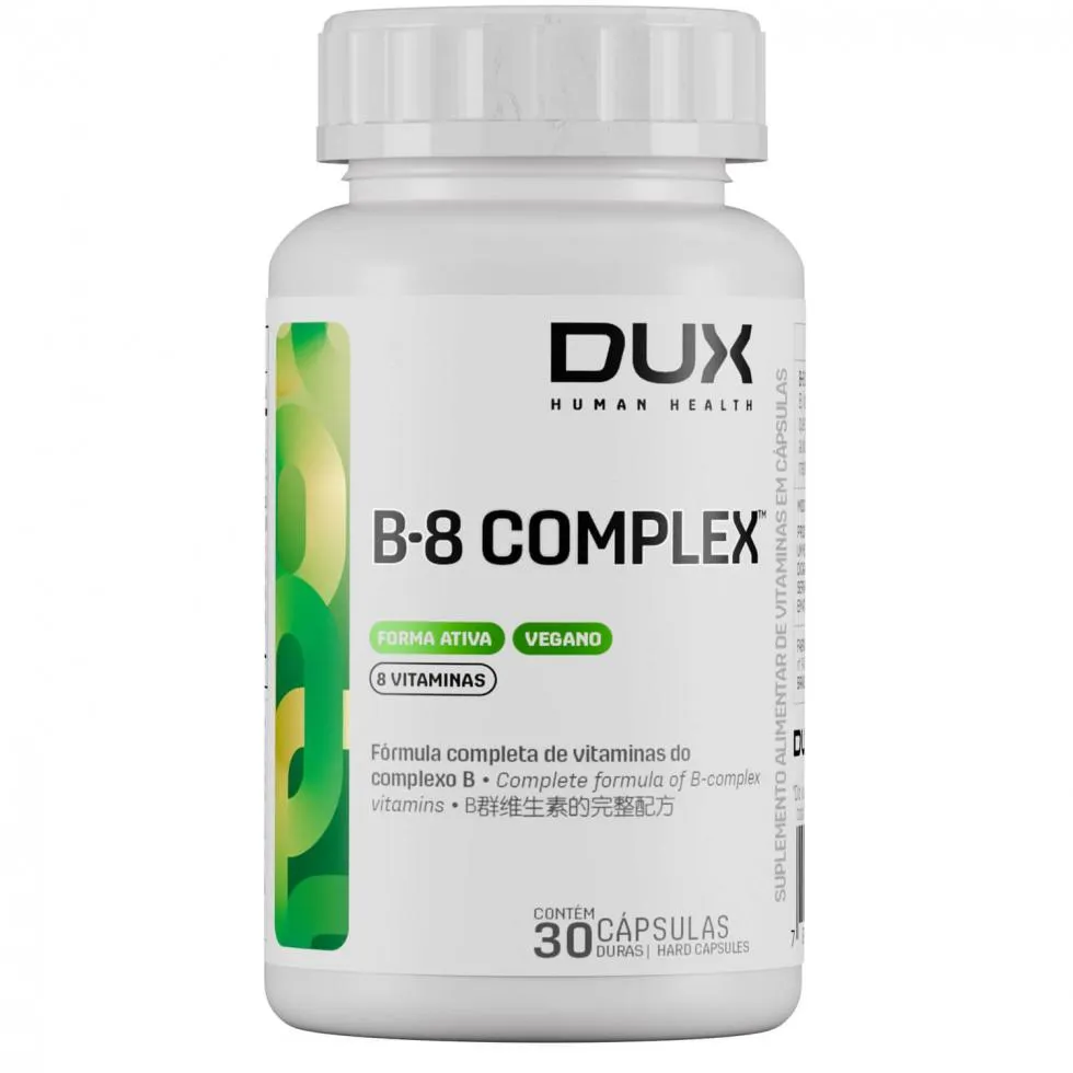 O Vitaminas do Complexo B Dux B-8 COMPLEX é um suplemento vegano que combina oito vitaminas do complexo B em suas formas ativas, incluindo B1, B2, B5, B6, B7, B9 e B12. Trata-se de um suplemento nutricional desenvolvido para fornecer um conjunto completo de vitaminas essenciais para o organismo.