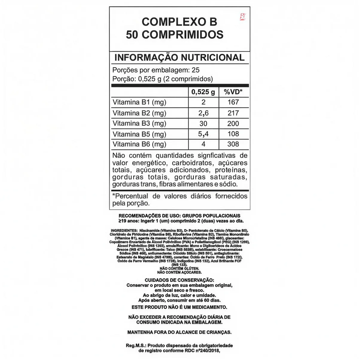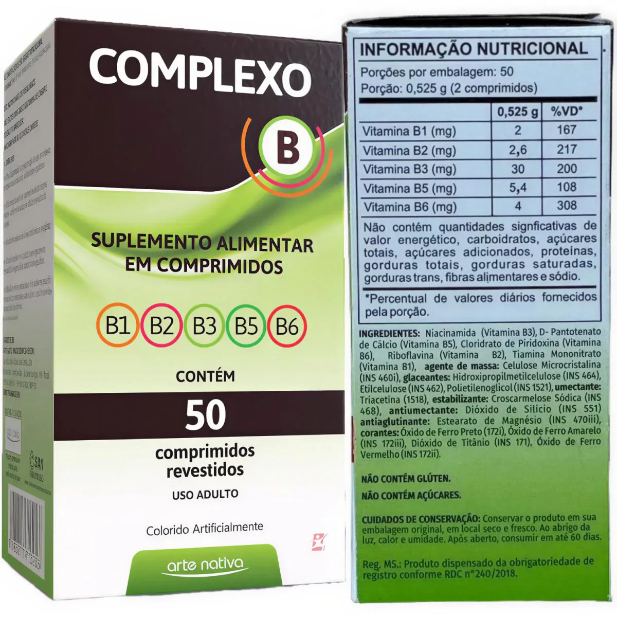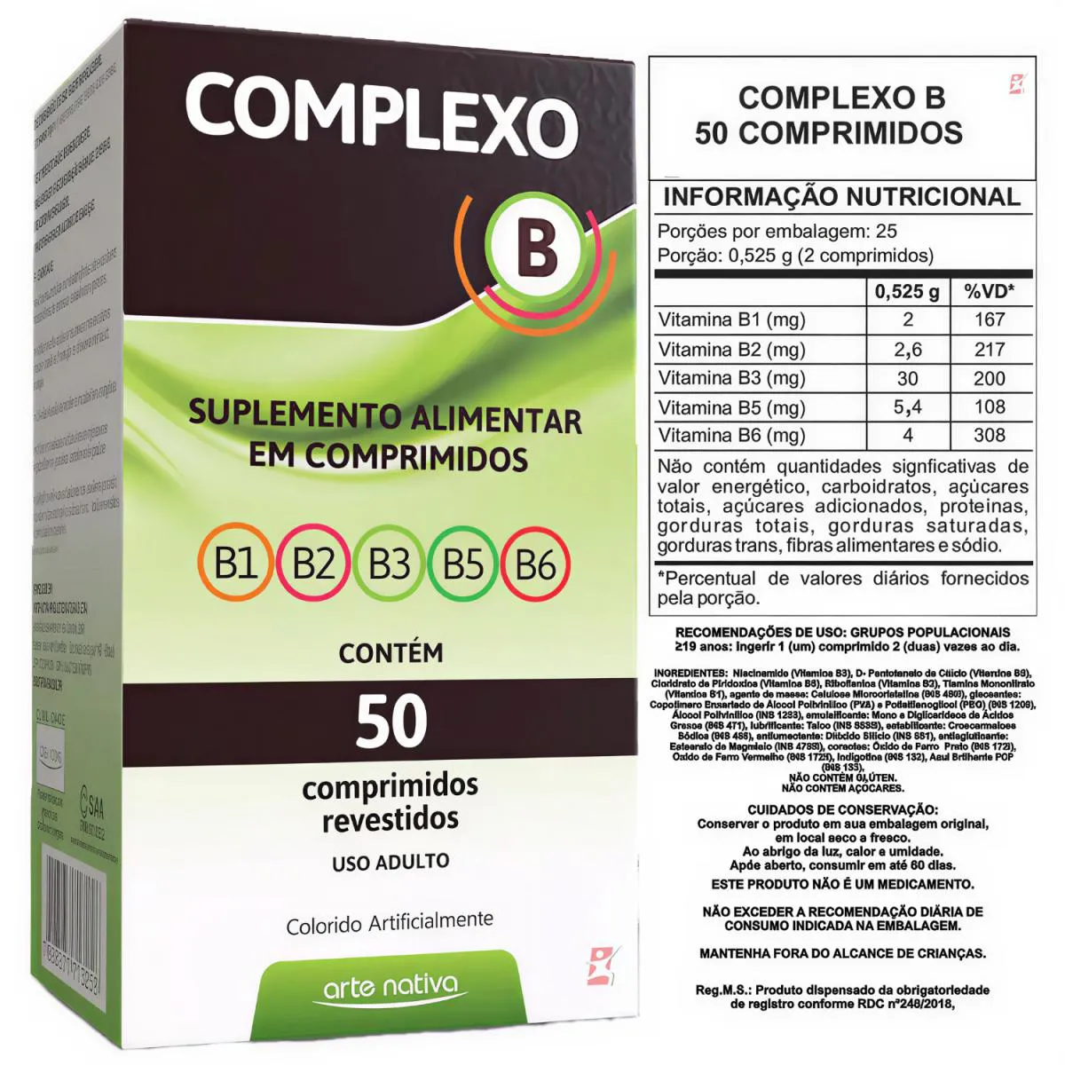 COMPLEXO B 50 COMPRIMIDOS – ARTE NATIVA   DESCRIÇÃO A niacina contribui para a manutenção da pele e auxilia no metabolismo de proteínas, carboidratos e gorduras. A vitamina B6 auxilia no funcionamento do sistema imune e na formação de células vermelhas do sangue. Ácido pantotênico auxilia no metabolismo energético. A riboflavina auxilia na formação de células vermelhas do sangue e é um antioxidante que auxilia na proteção dos danos causados pelos radicais livres. A tiamina auxilia no metabolismo de proteínas, carboidratos e gorduras e no metabolismo energético.   BENEFÍCIOS - 5 Vitaminas do Complexo B; - Alto rendimento; - Auxilia no metabolismo energético; - Auxilia no metabolismo de proteínas, carboidratos e gorduras; - Contribui para a manutenção da pele, olhos e cabelos; - Ajuda na atividade física; - Não contém glúten; - Não contém açúcares.   SUGESTÃO DE USO ≥ 19 anos: Ingerir 1 comprimido 2 (duas) vezes ao dia.   TABELA NUTRICIONAL - COMPOSIÇÃO e RECOMENDAÇÕES Anexo nas imagens.   DADOS TÉCNICOS Registro ANVISA – Produto dispensado da obrigatoriedade de registro de conforme RDC nº240/2018. Marca – Arte Nativa. Conteúdo líquido por frasco – 50 comprimidos. Rendimento líquido por frasco – 25 doses/porções.       Peso líquido por frasco – 13,13g. Peso bruto por frasco – 34g. Peso produto + embalagem(aproximado) – 150g. Código de barras (EAN) – 7898277713258. Dimensões do produto – largura: 4cm; altura: 9,5cm; comprimento: 4cm. Dimensões da embalagem/pacote – largura: 13 cm; altura: 7 cm; comprimento: 16 cm.   ITENS DO ANÚNCIO 1 Unidade do produto COMPLEXO B 50 COMPRIMIDOS – ARTE NATIVA. Total – 50 comprimidos CADA FRASCO.