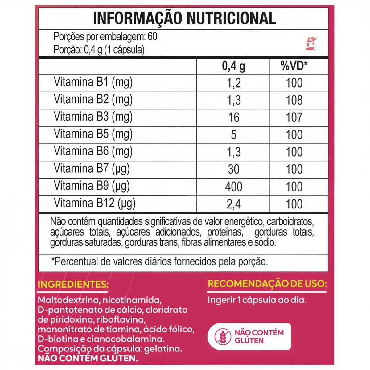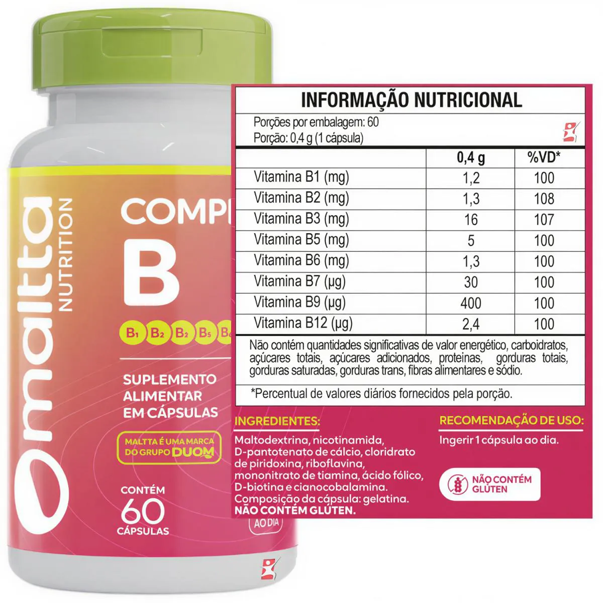 COMPLEXO B CONCENTRADO 8 VITAMINAS 1 AO DIA 60 CÁPSULAS - DUOM: MALTTA NUTRITION DESCRIÇÃO A Maltta conta com uma fórmula completa de vitaminas do complexo B. As vitaminas do complexo B, são hidrossolúveis e são as maiores responsáveis pela manutenção da saúde emocional e mental do ser humano. O organismo não faz reserva de vitamina B, por isso é necessário suprir esse composto essencial diariamente. • Tiamina (B1): Apresenta benefícios para musculatura corporal e auxilia no metabolismo energético; • Riboflavina (B2): Manutenção da pele e do metabolismo; • Niacina (B3): Leva oxigênio para as células; • Ácido pantotênico (B5): Estimula a reposição dos tecidos corporais; • Piridoxina (B6): Auxilia na produção de proteínas; • Biotina (B7): Contribui para o crescimento; • Ácido fólico (B9): Formação das hemácias e dos ácidos nucléicos; • Cobalamina (B12): Saúde das hemácias e dos neurônios. BENEFÍCIOS - Auxilia no sistema imunológico; - Poderoso Antioxidante; - Ajuda na defesa do organismo; - Aumenta a vitalidade e disposição; - Reduz a fadiga e dores musculares; - Auxilia na memória e na concentração; - Ajuda a suprir a necessidade de nutrientes; - Auxilia no combate do cansaço físico e mental. SUGESTÃO DE USO Ingerir 1 cápsula ao dia. TABELA NUTRICIONAL & COMPOSIÇÃO Anexo nas imagens. RECOMENDAÇÕES & CUIDADOS PRODUTO INDICADO A PESSOAS ACIMA DE 19 ANOS. ESTE PRODUTO NÃO É UM MEDICAMENTO. NÃO EXCEDER A RECOMENDAÇÃO DIÁRIA DE CONSUMO INDICADA NA EMBALAGEM. MANTENHA FORA DO ALCANCE DE CRIANÇAS. DADOS TÉCNICOS Marca – Duom: MALTTA NUTRITION. Conteúdo líquido por frasco – 60 cápsulas. Rendimento por frasco – 60 porções/doses. Peso por cápsula – 400mg. Peso líquido por frasco – 24g. Peso bruto total – 58g. Código de barras (EAN) – 7898958836986. Registro ANVISA – Dispensado de registro de acordo com a resolução da RDC 27/2010 da ANVISA. Dimensões do produto – altura 10 cm; largura 6 cm; comprimento 6 cm. Dimensões da embalagem padrão – altura 7 cm; largura 12,5 cm; comprimento 16cm. ITENS DO ANÚNCIO - 1 UNIDADE DO PRODUTO: COMPLEXO B CONCENTRADO 8 VITAMINAS 1 AO DIA 60 CÁPSULAS - DUOM: MALTTA NUTRITION. Total – 60 cápsulas POR FRASCO.