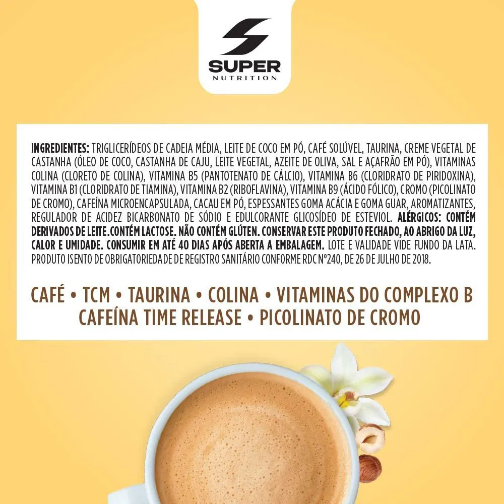 CAFÉ • TCM • TAURINA • SEM AÇÚCAR • ADOÇADO COM STÉVIACAFEÍNA TIME RELEASE • COLINA • minerais • PICOLINATO DE CROMO • VITAMINAS DO COMPLEXO BCafé, ingredientes premium e muito sabor de baunilha com avelã