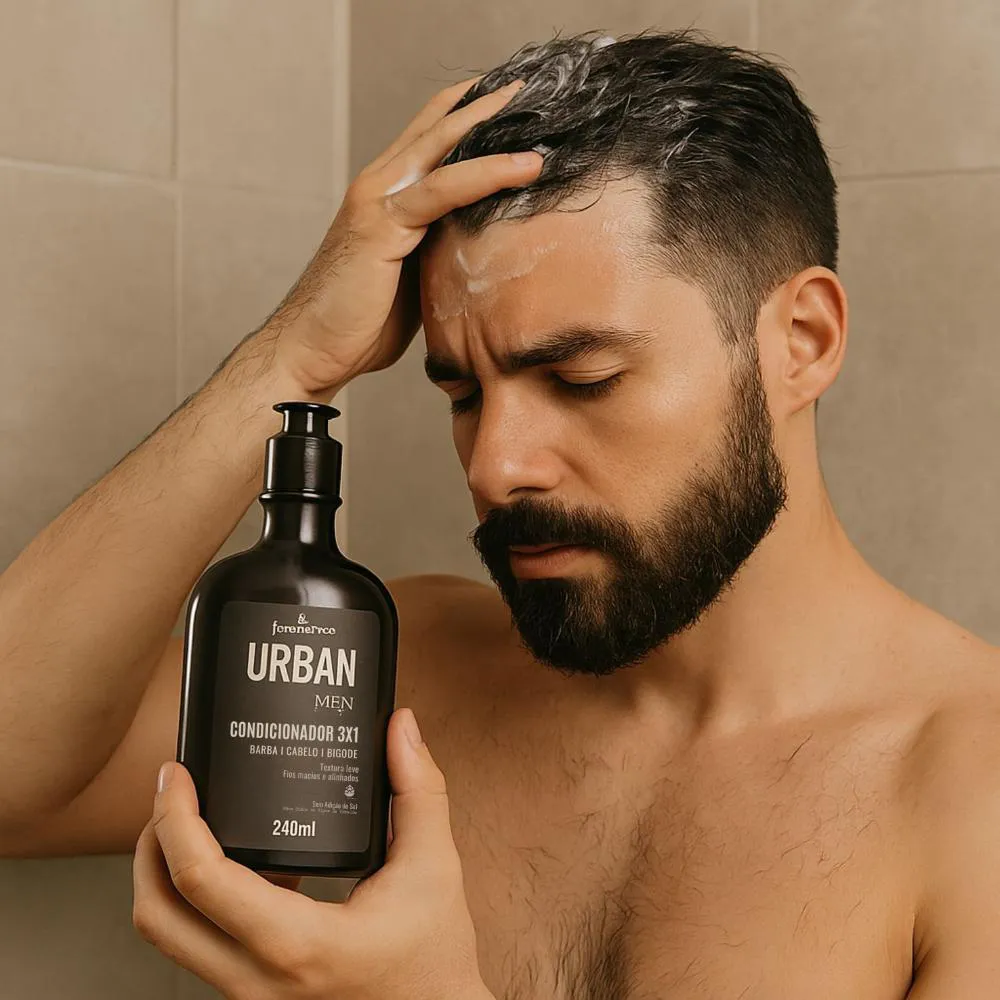 O condicionador 3x1 Urban Men hidrata e nutre os fios. Proporciona maciez e brilho. Facilita o penteado. Mantém pelos fios alinhados. . Características: - Para barba, cabelo e bigode. - Para todos os tipos de cabelos. - Textura leve. - Não contém sal. - Não testado em animais. - Uso diário. . Modo de uso: Após usar o shmapoo, com os cabelos e barba ainda úmidos, aplique o condicionador. Massageie levemente. Enxágue. . Composição: Water/Aqua, Cetearyl Alcohol, Behentrimonium Methosulfate, Cetyl Palmitate, Dicaprylyl Ether, Cetrimonium Chloride, Cyclopentasiloxane, Dimethiconol, Hydroxypropil Starch Phospate, Polyquaternium-55, Panthenol, PEG-90M, Tocopheryl Acetate, Caprylic/Capric Triclyceride, Coffea Arabica Seed Oil, Parfum (Butylphenyl Methylpropional, Limonene, Linalool), Disodium EDTA, Citric Acid, Lauridimonium Hydroxypropyl Hydrolyzed Wheat Protein, Methylchloroisothiazolinone, Methykisothiazolinone, Hordeum Vulgare Seed Extract, Humulus Lupulus Flower Extract, Avena Sativa Bran Extract.
