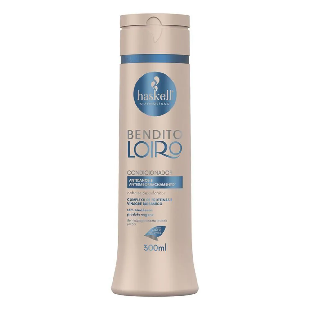 O Condicionador Antidanos Bendito Loiro da Haskell reduz os fios elétricos, auxilia na reposição de proteína e proporciona maciez e leveza diariamente. Ideal para recuperar os cabelos descoloridos, possui ação antiemborrachamento e antiporosidade, protegendo os fios de danos futuros. Sua formulação conta com um complexo de proteínas e vinagre balsâmico que, juntos, promovem a regeneração capilar de maneira intensiva, repondo a massa proteica nos fios. Indicação: Para cabelos descoloridos. Benefícios: Ideal para recuperar os cabelos descoloridos. Reduz fios elétricos. Proporciona maciez e leveza diariamente. Protege os fios de danos futuros. Ação antiemborrachamento e antiporosidade. Regenera os cabelos intensivamente. Reposição de massa proteica nos fios. Direção olfativa: floral frutal. Especificações: pH Sem parabenos Sem corantes Low poo DÚVIDAS FREQUENTES: Qual a validade do produto? Haskell tem validade de 2 anos a partir da data de fabricação. Tem em estoque? Temos todos os nossos produtos disponíveis para . Produto? Adquirido diretamente do distribuidor autorizado Haskell. personalizado? Elaboração de kits sob medida. OBSERVAÇÕES SOBRE A COMPRA: Mimos e + mimos e com o pedido sempre tem um cupom! Sabia!? Compras efetuadas até as 14 hrs serão enviadas no mesmo dia. Compras efetuadas sexta-feira após as 14 hrs serão enviadas no dia útil seguinte. Todos os produtos são enviados com . Caso seu produto chegue não se preocupe, fale com a gente! Quantidade de itens: | Volume do item: | Principais Características do Produto 2: | Contém conteúdo líquido: | Palavras-chave de Pesquisa: | Principais Características do Produto 0: | baterias são necessárias?: | Aviso de : | Tipo de cabelo: | Estilo de vida: | Contagem de unidades: | Aroma: | Principais Características do Produto 1: | Informações sobre alérgenos: | Ingredientes: | Formato do item: | Gênero do público-alvo: | Preço sugerido sem impostos: | Palavra-chave do público-alvo: | O Produto pode Expirar: | Fonte de energia: | Fabricante: