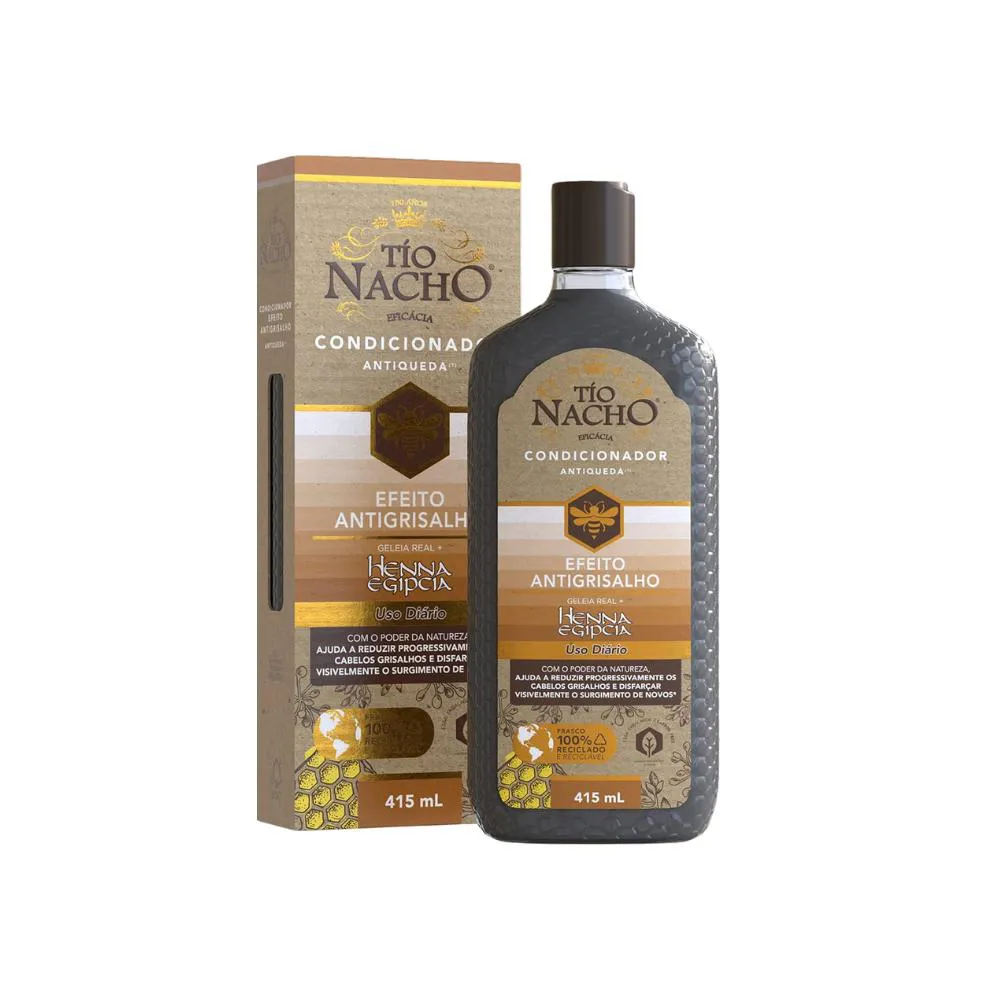 O condicionador Tío Nacho Efeito Antigrisalho foi desenvolvido para complementar o tratamento da linha, ajudando a reduzir gradualmente a aparência dos fios grisalhos enquanto fortalece e hidrata o cabelo. Sua fórmula com Geleia Real e Henna Egípcia nutre profundamente, revigora a cor natural e promove cabelos mais encorpados, macios e brilhantes. Mais do que disfarçar os fios brancos, este condicionador também auxilia no crescimento saudável, no combate à queda por quebra e na manutenção de um couro cabeludo mais resistente e nutrido.