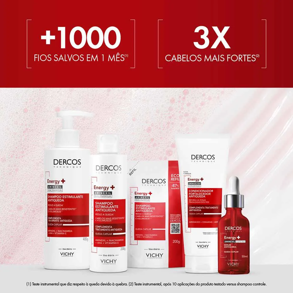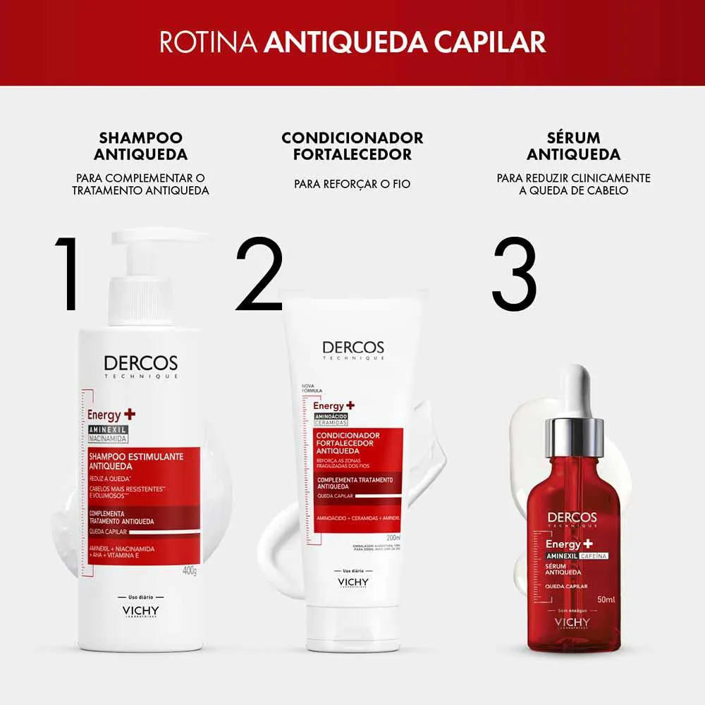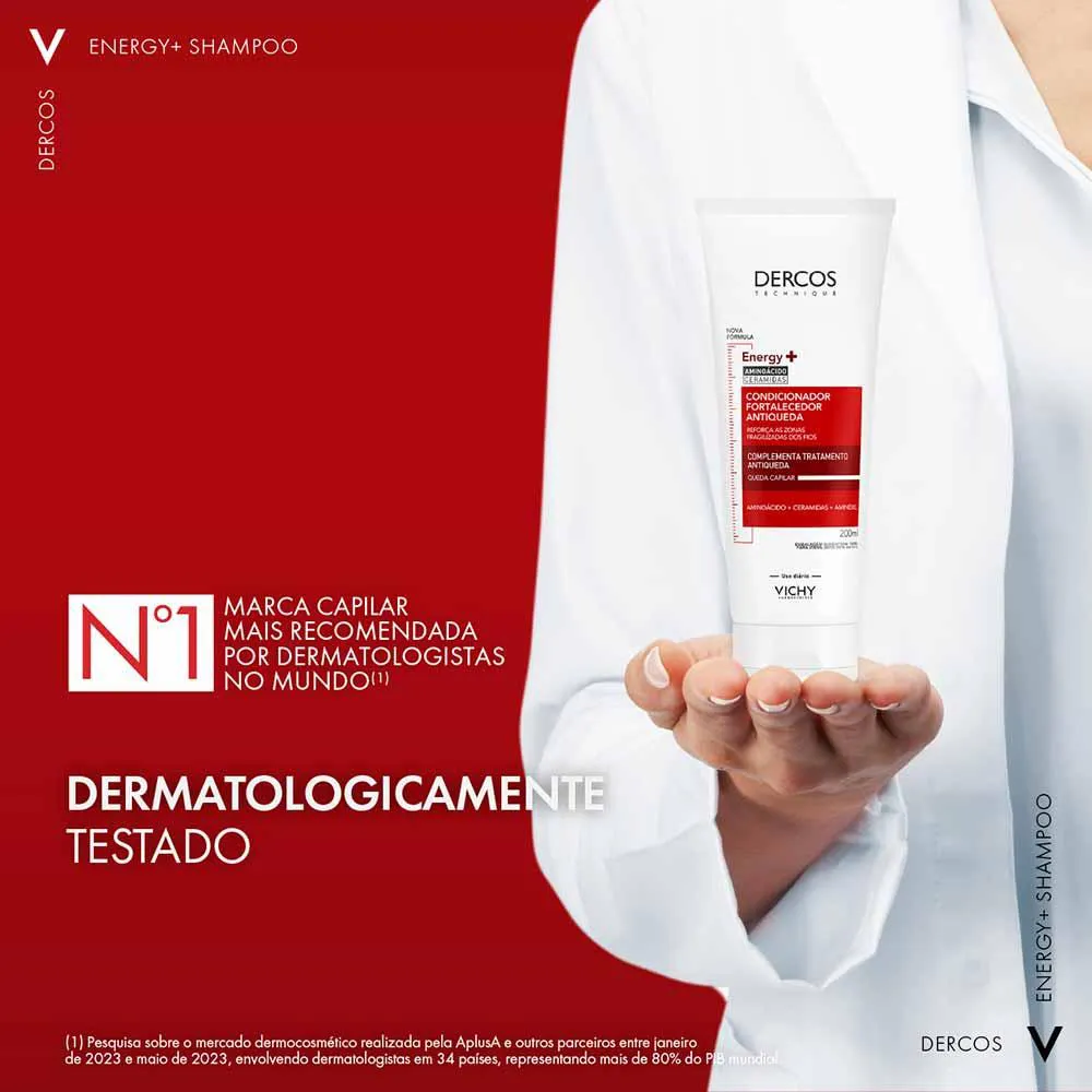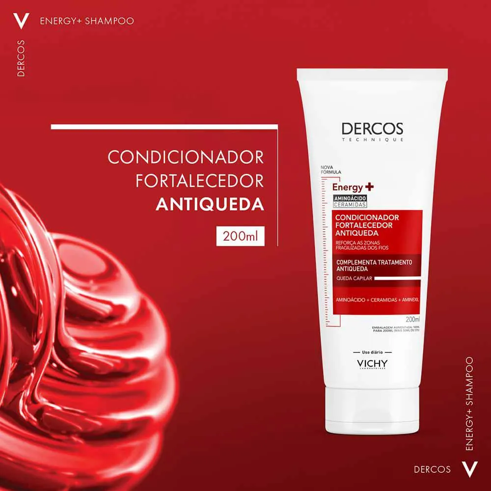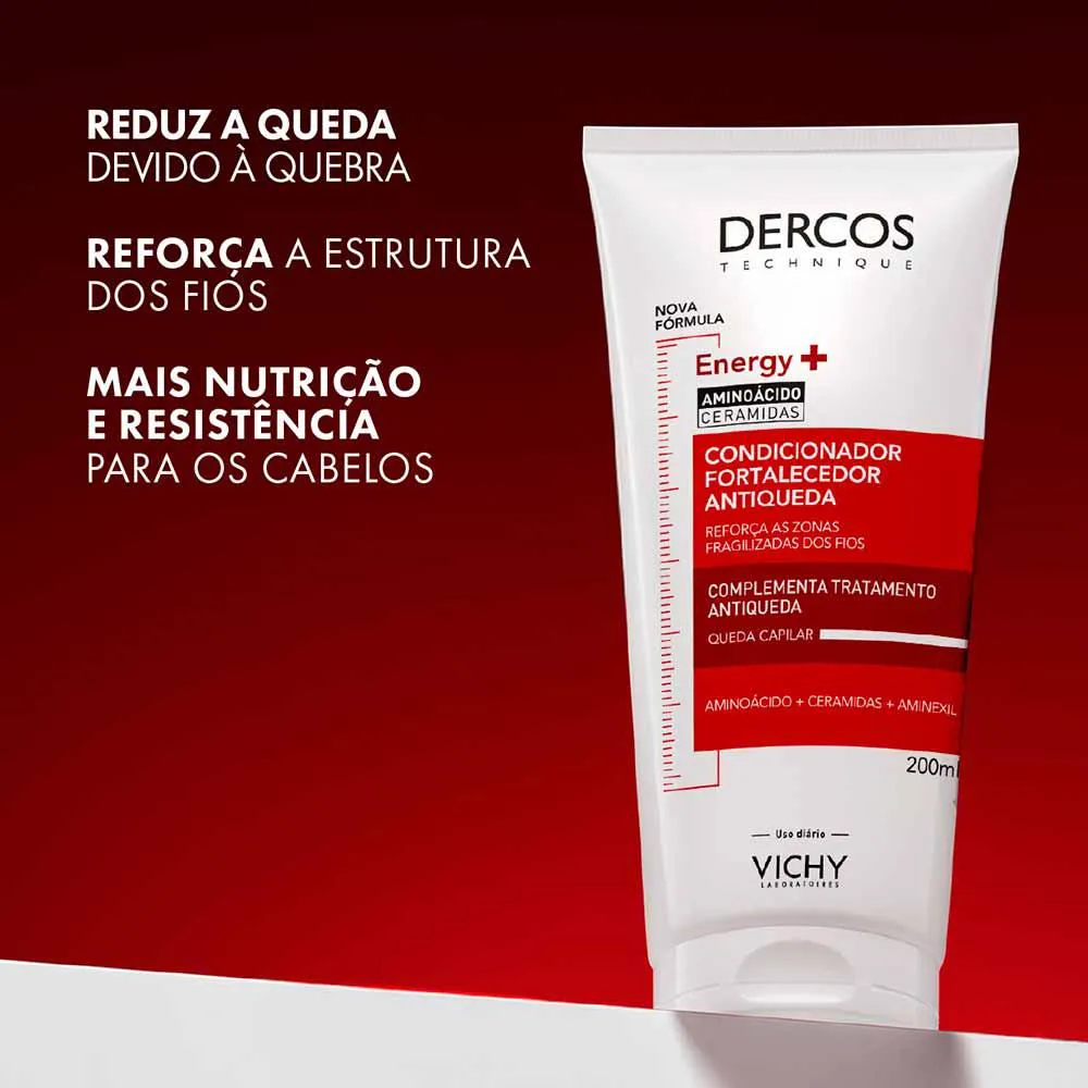 O Condicionador Antiqueda e Fortalecedor Vichy Dercos Energy+ foi desenvolvido para reduzir a quebra capilar desde a primeira aplicação e devolver força aos cabelos enfraquecidos ou com tendência à queda.