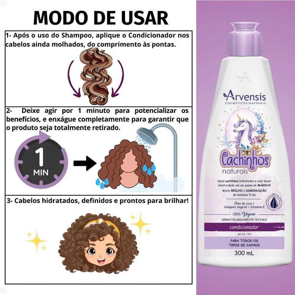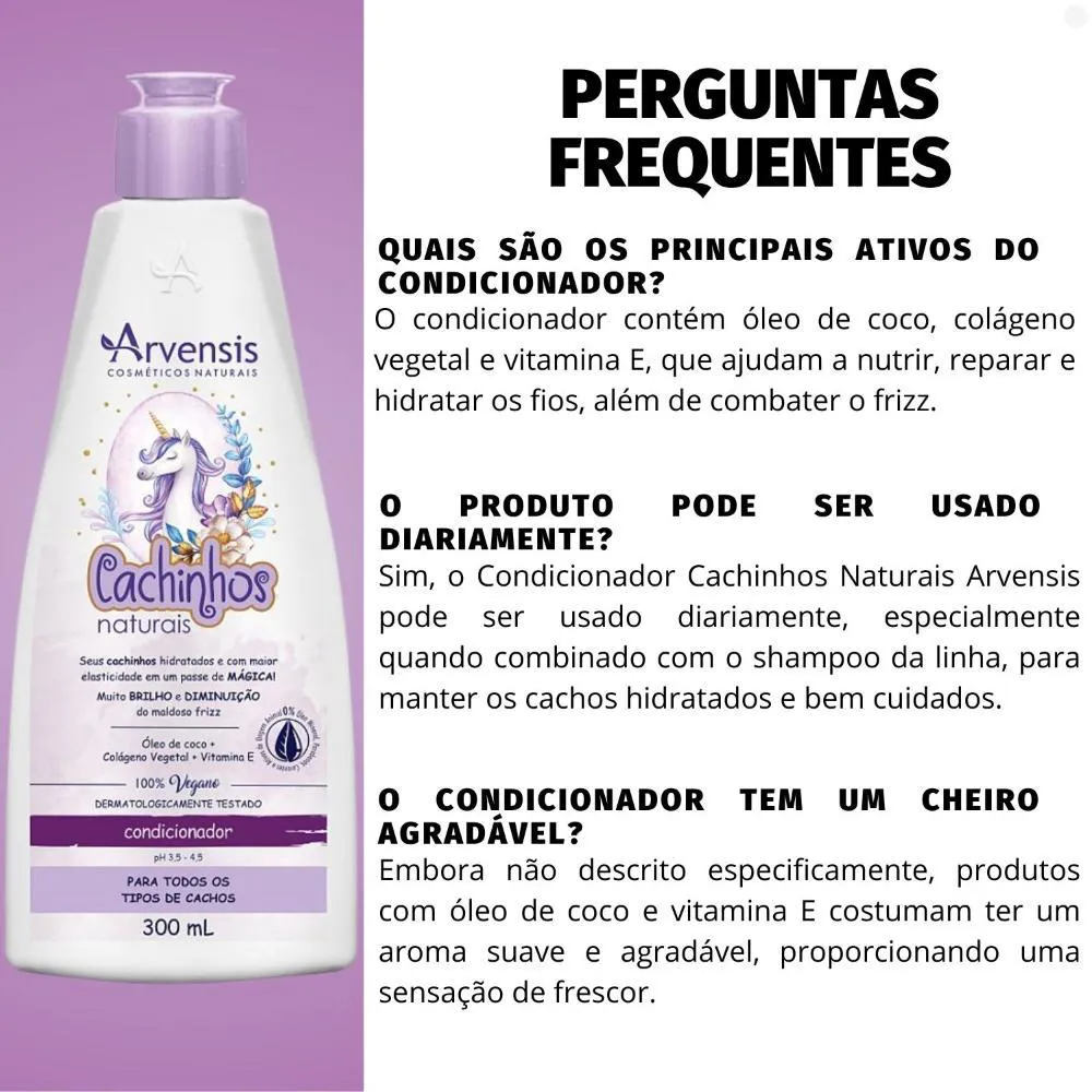 condicionador Arvensis Cachinhos Naturais 300ml O Condicionador Cachinhos Naturais foi especialmente elaborado para o tratamento de todos os tipos de ondinhas e cachinhos. Vitaminado com óleo de coco, colágeno vegetal e vitamina e, promove selamento das cutículas, combatendo o maldoso frizz e oferecendo, condicionamento equilibrado, maciez, aumento da elasticidade e ultra brilho para os seus cabelos. . Modo de usar: Após o uso do shampoo, aplique o Condicionador Cachinhos Naturais do comprimento às pontas, massageando suavemente. Deixe agir por 1 minuto, em seguida enxágue com água em abundância. O uso completo da linha Cachinhos Naturais favorece os resultados. Precauções: Somente para uso externo. Evitar contato com os olhos. Deve ser aplicado por adulto ou sob sua supervisão. Não usar se o couro cabeludo estiver ferido ou irritado. Em caso de irritação suspender o uso e procurar um médico. Caso o produto entre em contato com os olhos, lavar com água corrente em abundância e procurar um médico. Manter em local fresco e longe da iluminação solar. . Perguntas Frequentes Qual é a função principal do Condicionador Arvensis Cachinhos Naturais? O condicionador tem como principal função desembaraçar, hidratar e nutrir os cabelos cacheados, proporcionando mais maciez, definição e controle de frizz. O condicionador pode ser usado diariamente? Sim, ele é suave e pode ser utilizado no dia a dia, principalmente para cabelos cacheados que precisam de cuidados constantes de hidratação e nutrição. O condicionador é bom para hidratar os cachos? Sim, ele contém ingredientes hidratantes que ajudam a repor a umidade e a deixar os cachos mais definidos e macios. Preciso de muito produto para ter um bom resultado? Não, uma pequena quantidade de condicionador é suficiente para desembaraçar e hidratar os cabelos, pois ele tem boa espalhabilidade. . Código de Registro Sanitário (ANVISA) 25351.562029/2019-40