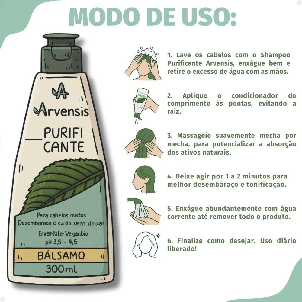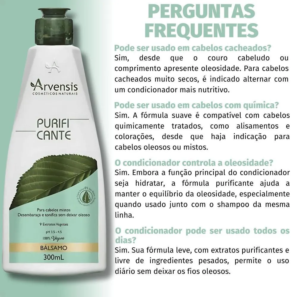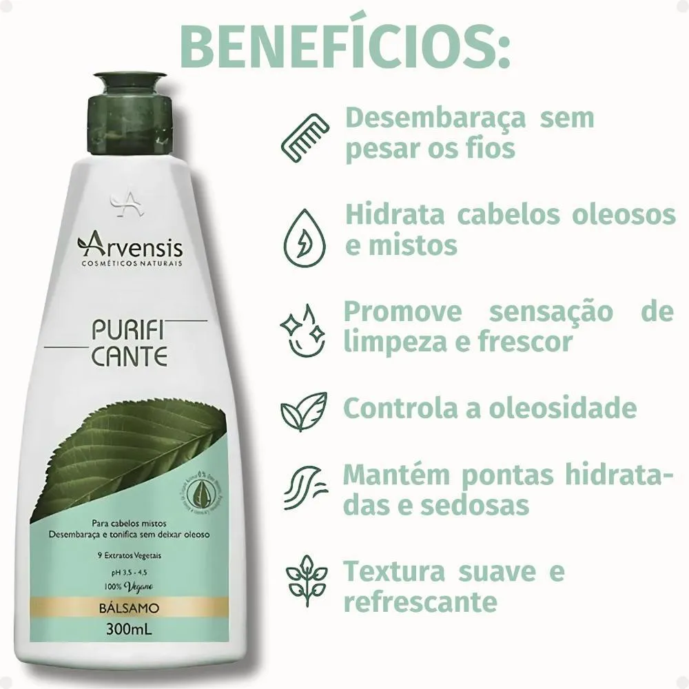 condicionador Bálsamo Arvensis Purificante 300ml Sinta a leveza e a pureza nos seus cabelos com o Condicionador Bálsamo Arvensis Purificante. Desenvolvido especialmente para cabelos oleosos ou mistos, ele desembaraça, hidrata na medida certa e proporciona uma sensação refrescante, sem pesar os fios. Com fórmula balanceada e enriquecida com extratos botânicos purificantes, este condicionador ajuda a controlar a oleosidade, ao mesmo tempo que mantém o comprimento e as pontas hidratadas e macias. Ideal para quem busca fios soltos, leves e com toque sedoso. Sua textura leve e livre de ingredientes agressivos como parabenos, petrolatos e corantes torna o produto ideal para o uso diário e para rotinas de cuidados mais naturais.