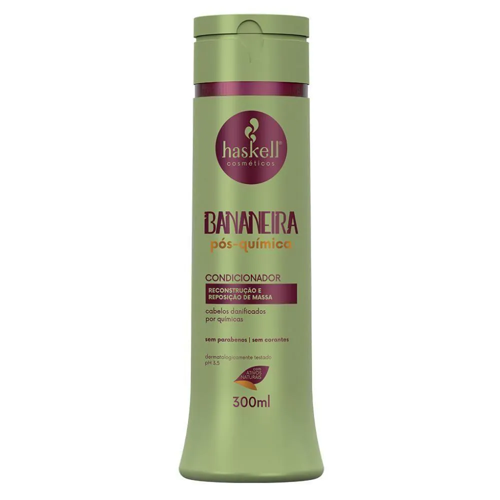 O Condicionador Bananeira Pós Química é especialmente formulado para cabelos s por procedimentos químicos. Sua possui ação emoliente e hidratante, selando as cutículas e proporcionando reconstrução profunda da fibra capilar danificada. A associação dos ativos LunaMatrix System aos nutrientes da bananeira devolve a massa capilar perdida nos processos químicos, minimizando danos futuros e melhorando a elasticidade dos fios. Benefícios: Reconstrói cabelos s por químicas. Proporciona reparação profunda da fibra capilar. Minimiza danos futuros e melhora a elasticidade dos fios. Direção olfativa: Frutal floral. Especificações: pH Sem parabenos | Sem corantes Low poo Indicação: Ideal para cabelos s por químicas. DÚVIDAS FREQUENTES: Qual a validade do produto? Haskell tem validade de 2 anos a partir da data de fabricação. Tem em estoque? Temos todos os nossos produtos disponíveis para . Produto? Adquirido diretamente do distribuidor autorizado Haskell. personalizado? Elaboração de kits sob medida. OBSERVAÇÕES SOBRE A COMPRA: Mimos e + mimos e com o pedido sempre tem um cupom! Sabia!? Compras efetuadas até as 14 hrs serão enviadas no mesmo dia. Compras efetuadas sexta-feira após as 14 hrs serão enviadas no dia útil seguinte. Todos os produtos são enviados com . Caso seu produto chegue não se preocupe, fale com a gente! Palavras-chave de Pesquisa: | Principais Características do Produto 2: | Contagem de unidades: | Quantidade de itens: | Aviso de : | Preço sugerido sem impostos: | O Produto pode Expirar: | Contém conteúdo líquido: | Informações sobre alérgenos: | Ingredientes: | baterias são necessárias?: | Volume do item: | Fabricante: | Gênero do público-alvo: | Principais Características do Produto 0: | Formato do item: | Tipo de cabelo: | Principais Características do Produto 1: | Palavra-chave do público-alvo: | Estilo de vida: | Fonte de energia: | Aroma: