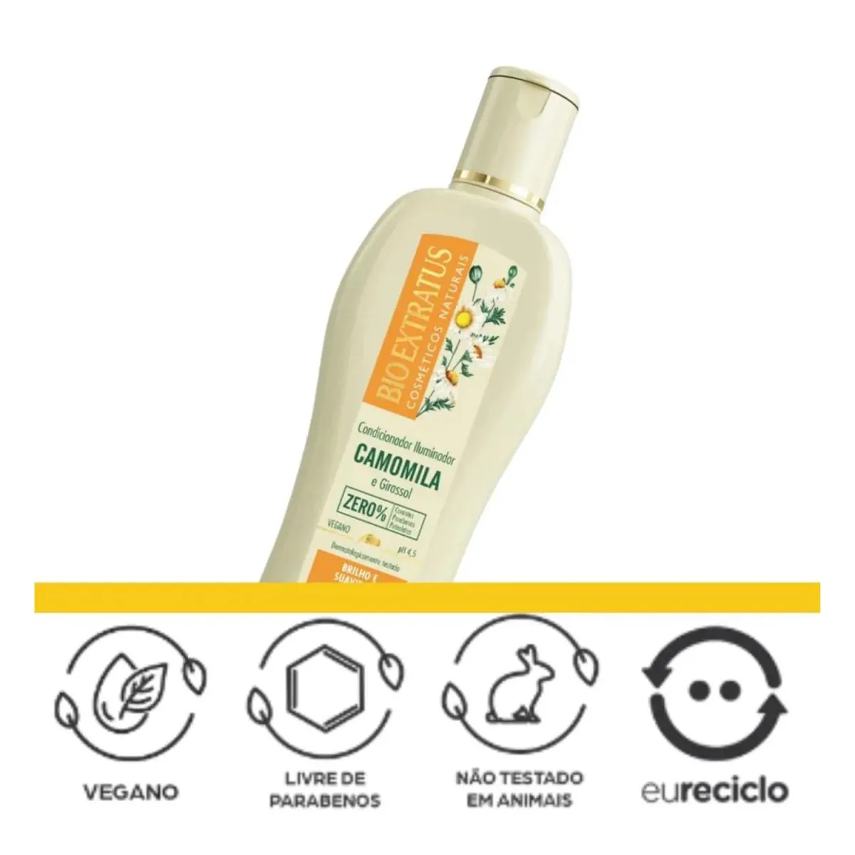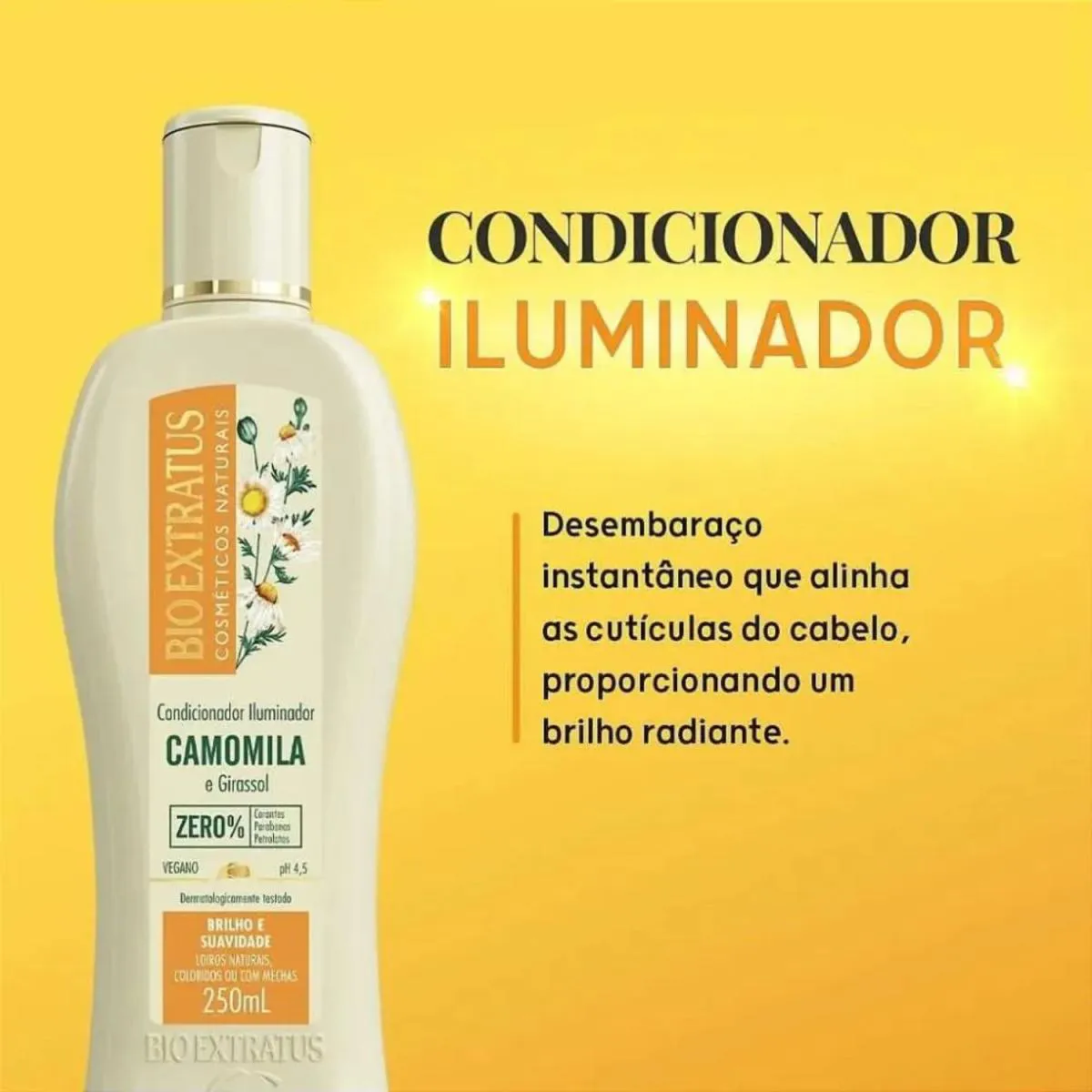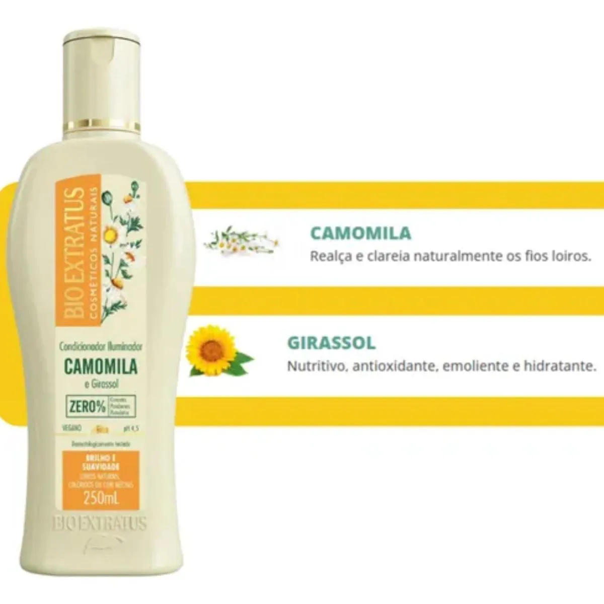 condicionador Camomila e Girassol – Bio Extratus O Condicionador Camomila e Girassol da Bio Extratus foi formulado para promover cabelos mais macios, brilhantes e cheios de vitalidade. Com uma combinação única de camomila, conhecida por suas propriedades suavizantes e clareadoras naturais, e girassol, rico em antioxidantes e vitaminas, este kit oferece cuidados especiais para cabelos loiros, descoloridos ou com mechas. A linha proporciona hidratação intensa e proteção contra os danos diários, deixando os fios sedosos, com brilho natural e um aroma suave e delicado. Ideal para quem deseja manter a beleza e a saúde dos cabelos, sem perder a luminosidade. Características: · Ideal para cabelos loiros, descoloridos ou com mechas · Camomila para suavização e efeito clareador natural · Girassol para nutrição e proteção antioxidante · Hidratação profunda e controle do frizz · Fórmula livre de parabeno, sulfato e corantes artificiais · Fragrância suave e refrescante . Condicionador: Após o shampoo, aplique nos fios, deixe agir por alguns minutos e enxágue. Com o Condicionador Camomila e Girassol, seus cabelos ficam hidratados, brilhosos e com a suavidade que você merece, mantendo a saúde dos fios e o efeito luminoso natural. Imagens meramente ilustrativas. Todas as Informações Divulgadas são de Responsabilidades Exclusivas do Fabricante / fornecedor.