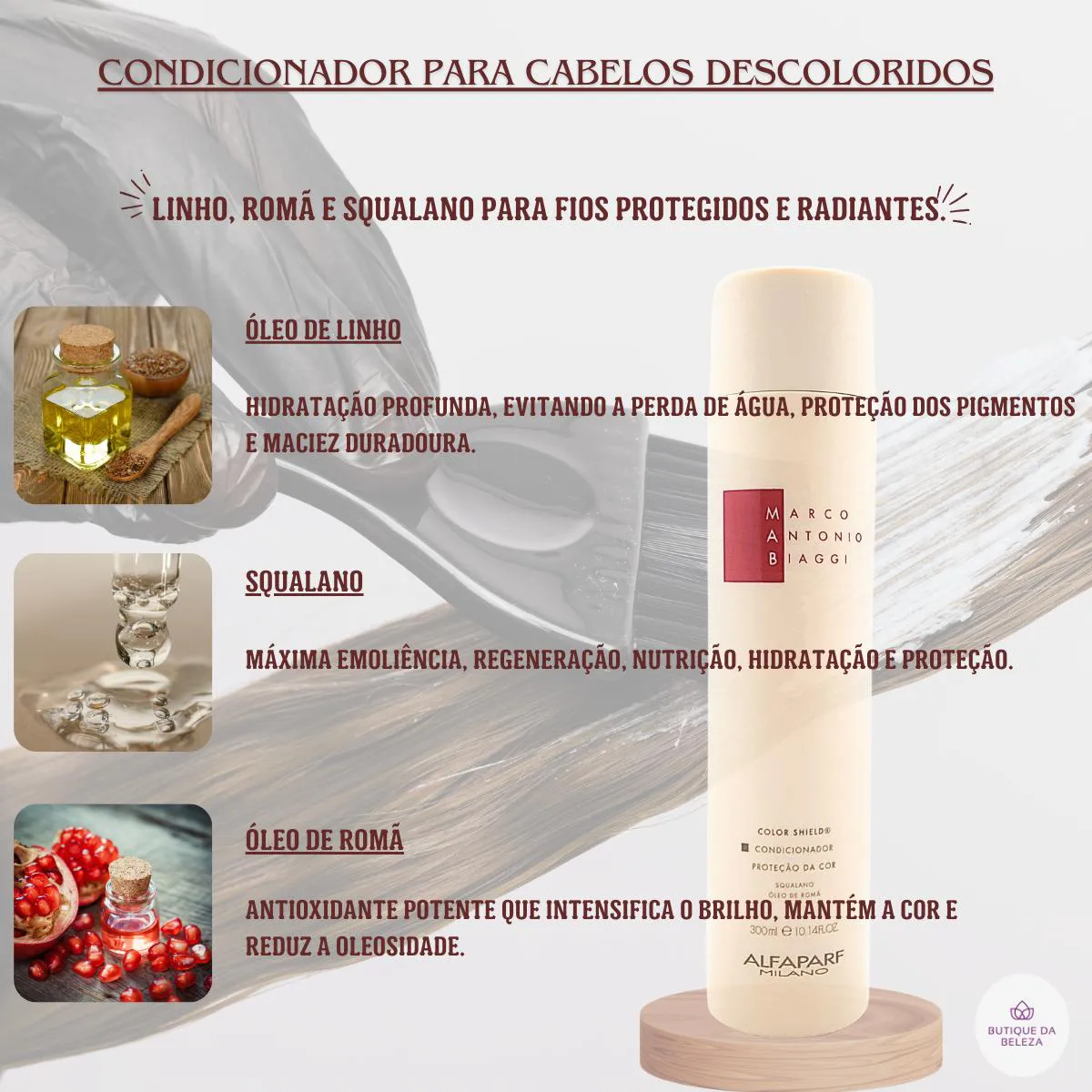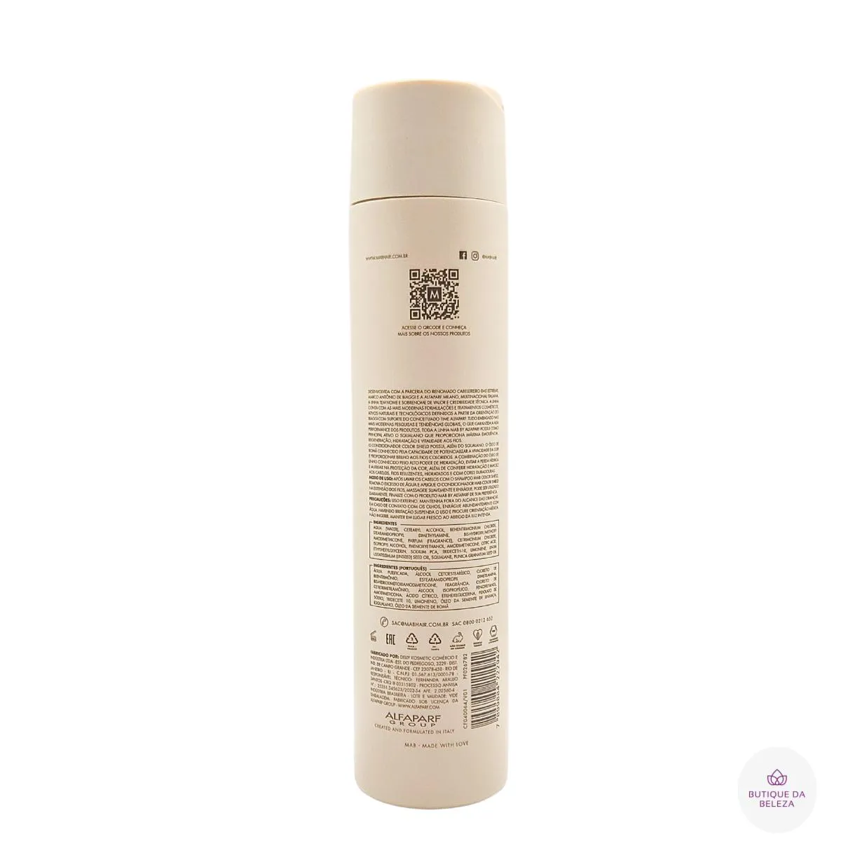 SERVIR E AJUDAR SÃO NOSSOS DEVERES condicionador MAB ALFAPARF MILANO - COLOR SHIELD Procurando uma solução para cabelos desbotados? Está cansado de ver a cor dos seus cabelos desbotar após alguns dias da coloração? Com o Condicionador Mab Color Shield Proteção da Cor, para cabelos descoloridos que hidrata e protege, seus cabelos coloridos nunca mais serão os mesmos. Sua fórmula avançada combina ingredientes poderosos que não só protegem a cor, mas também proporcionam hidratação profunda e brilho duradouro. Revitalize seus cabelos com brilho e durabilidade usando o Color Shield da MAB! Garanta fios deslumbrantes e cheios de vida com squalano, óleo de romã e óleo de linho. Squalano: Máxima emoliência, regeneração, nutrição, hidratação e proteção. Óleo de Romã: Antioxidante potente que combate radicais livres, intensifica o brilho, mantém a cor e equilibra o pH. Óleo de Linho: Hidratação profunda, proteção dos pigmentos e maciez duradoura. INDICADO PARA QUAL tipo de cabelo Cabelos Coloridos e Descoloridos Cabelos Quimicamente Tratados Todos os Tipos de cabelo