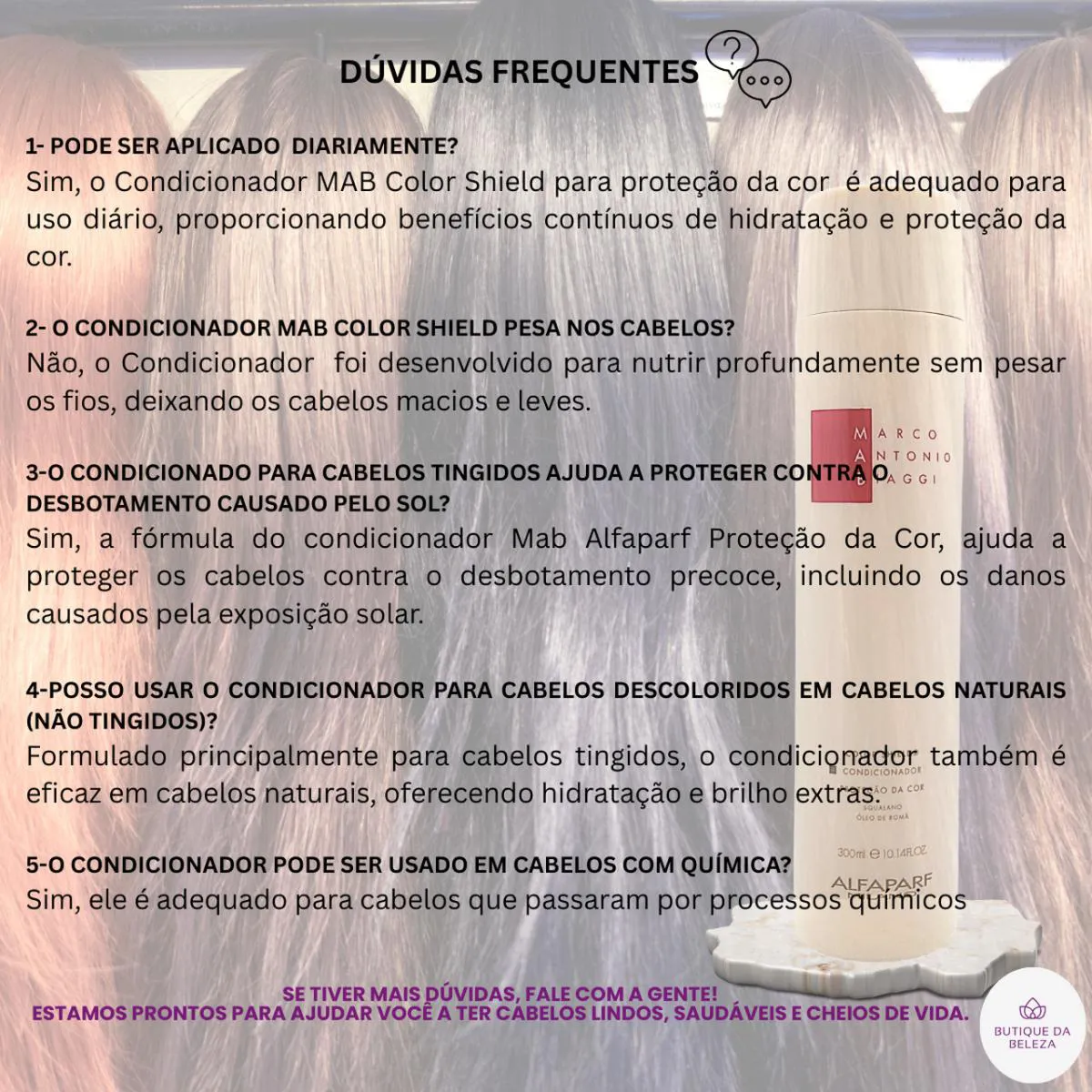 Sim, a fórmula do Condicionador MAb Color Shield ajuda a proteger os cabelos contra o desbotamento precoce, incluindo os danos causados pela exposição solar. Posso usar o Condicionador MAB Color Shield em cabelos naturais (não tingidos)?