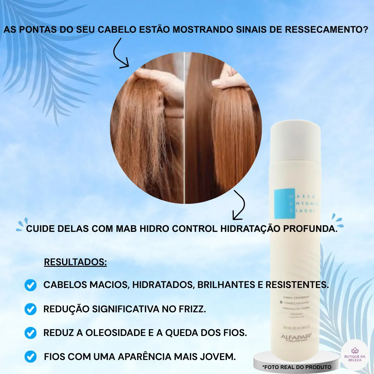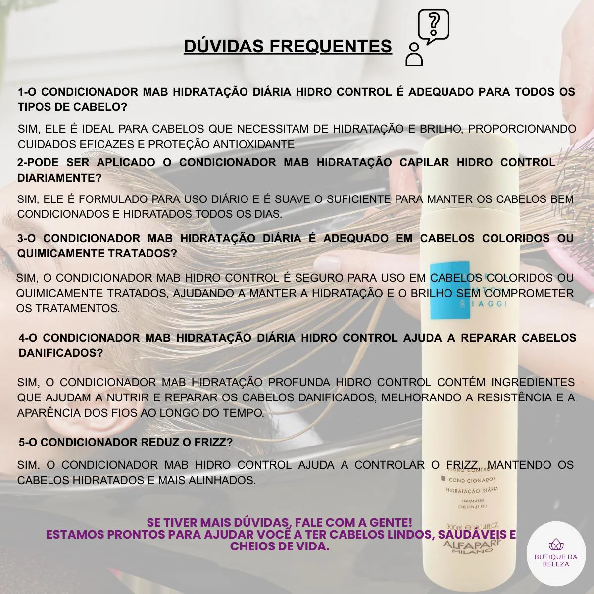 DICA DA BUTIQUE DA BELEZA Após o condicionador MAB Hidro Control, uma dica é aplicar um finalizador da Linha Mab de sua preferência para potencializar os benefícios do condicionador e proteger os fios ao longo do dia.